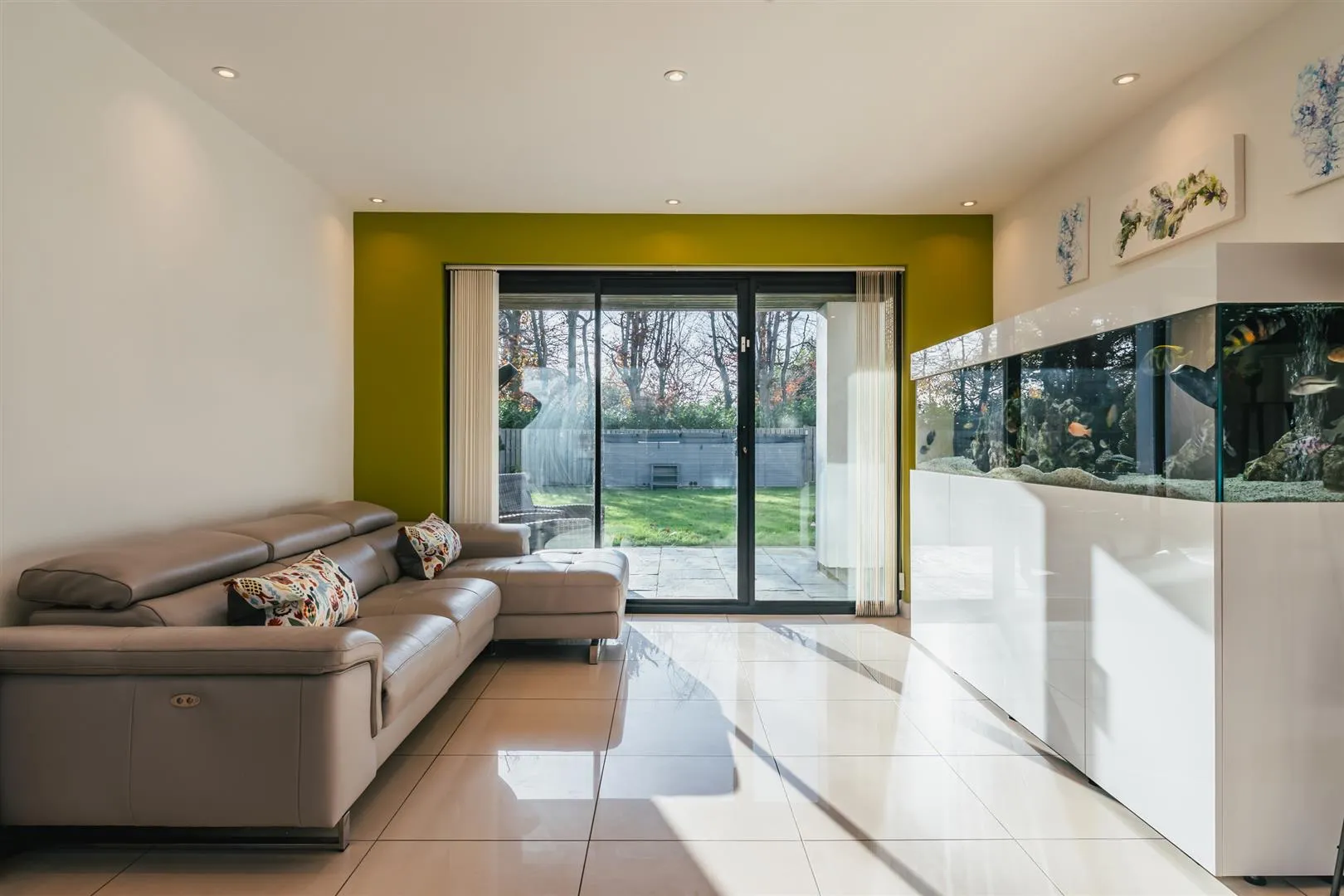 A light and spacious reception room with a front facing aluminium double glazed window, recessed lighting, TV/aerial points and porcelain tiled flooring with under floor heating. A sliding aluminium door with a double glazed panel and matching side panels opens to the front of the property.