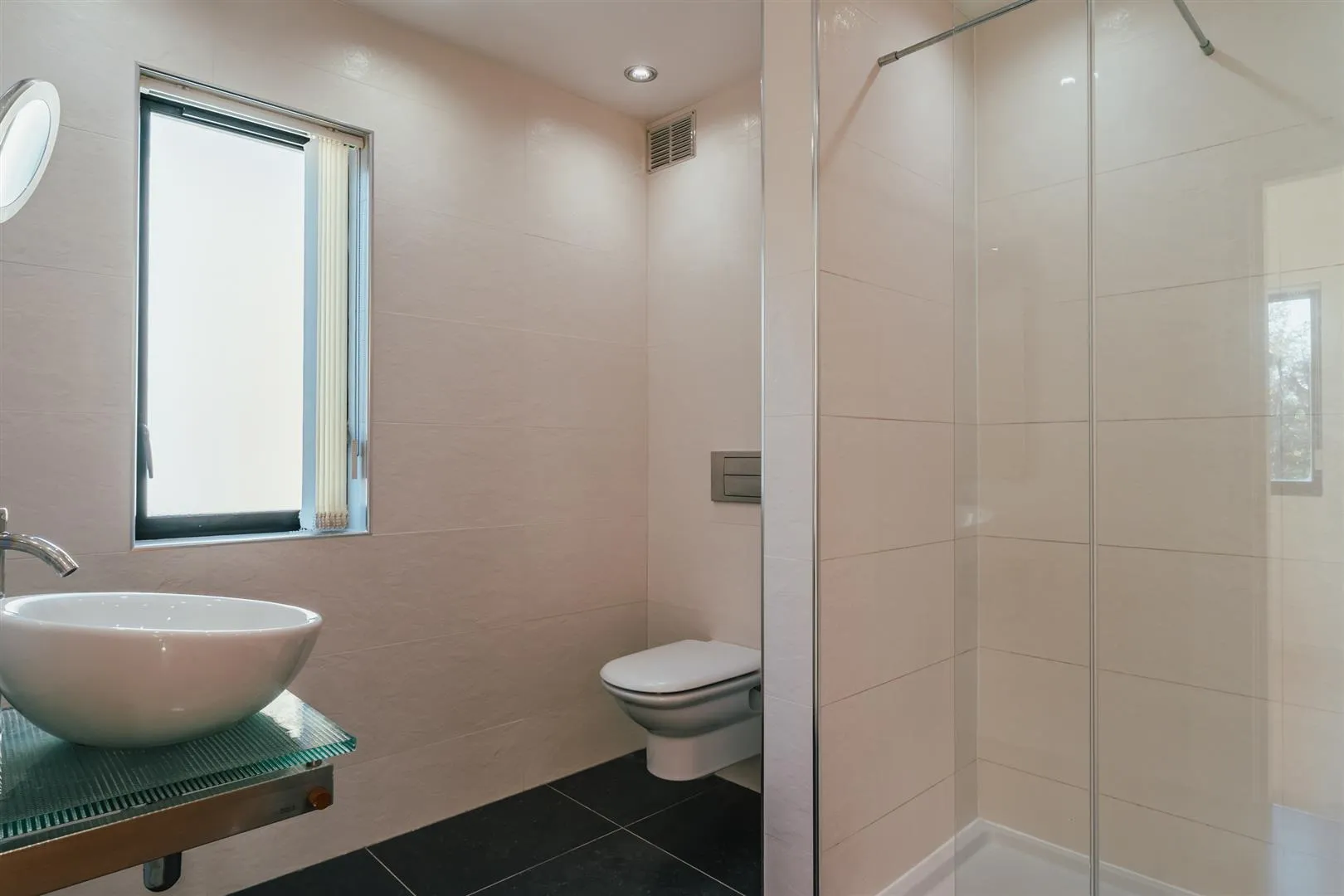 Being fully tiled and having a side facing aluminium double glazed obscured window, recessed lighting, extractor fan, chrome heated towel rail and under floor heating. There is a Roca suite in white, which comprises a wall mounted WC and a wash hand basin with a chrome mixer tap. To one corner is a shower enclosure with a fitted Roca rain head shower and a glazed screen/door.