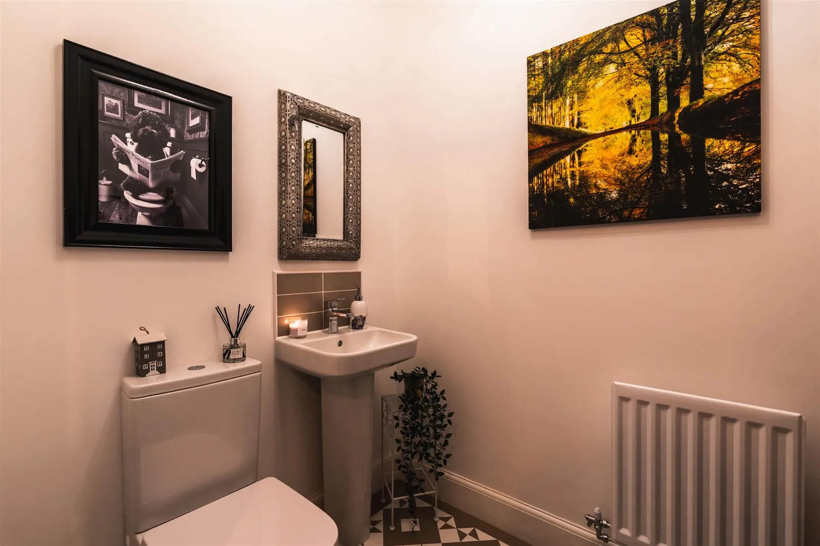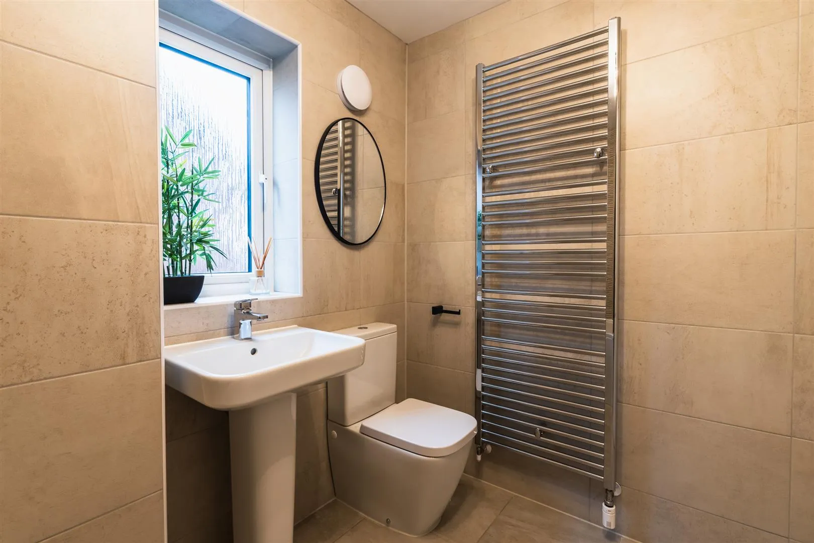 With a side facing UPVC double glazed obscured window, flush light point, extractor fan, chrome heated towel rail and tiled flooring. An Ideal Standard suite in white comprises a low-level WC and a pedestal wash hand basin with a chrome mixer tap and storage above. To one corner is a separate fully tiled shower enclosure with a fitted shower and a glazed screen/door.