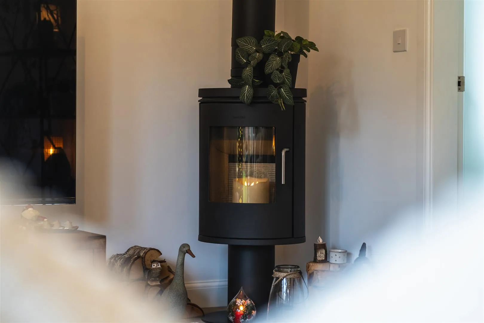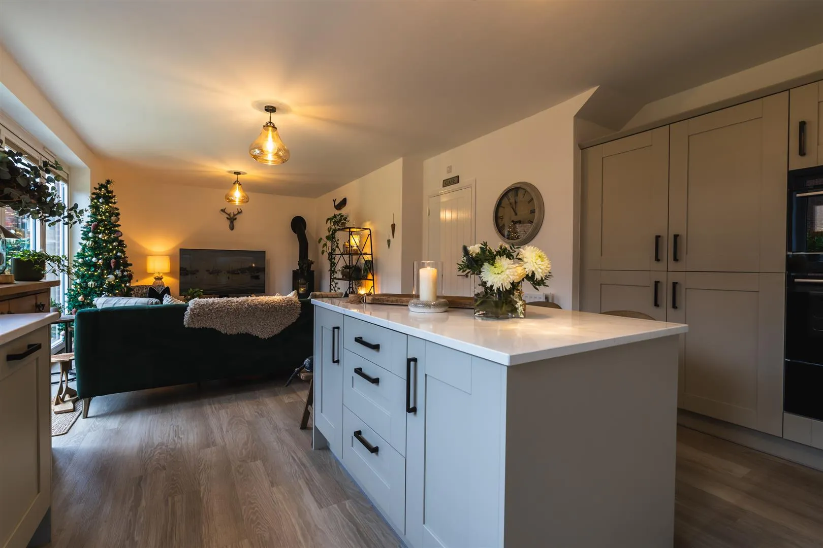 A superb living kitchen having a rear facing UPVC double glazed window, pendant light points, TV/aerial point, central heating radiators, one with a decorative cover and Karndean flooring. The focal point of the room is the Morso multi-fuel log burner with a stone hearth. A range of fitted base/wall and drawer units incorporate a work surface, upstands, under-counter lighting and a 1.5 bowl, stainless steel sink with a chrome mixer tap. Appliances include a Bosch six-ring gas hob, extractor hood, a Bosch microwave, Bosch oven, a full-height fridge/freezer and an Indesit dishwasher. A separate central island has a matching work surface that has the provision for seating for three chairs. A timber door opens to the utility room and UPVC bi-folding doors with double glazed panels open to the rear of the property.