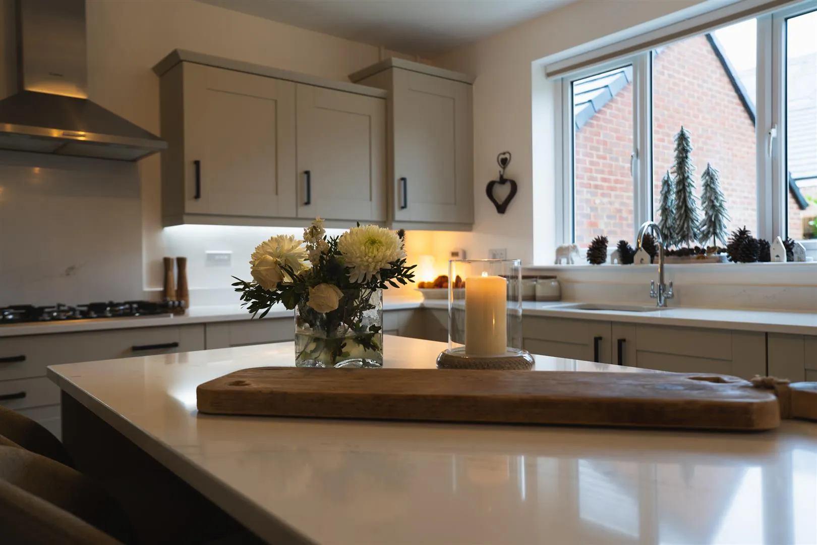 With a flush light point, extractor fan, a central heating radiator and Karndean flooring. There is a base unit incorporating a work surface and a 1.0 bowl stainless steel sink with a chrome mixer tap. There is the provision for a washing machine and tumble dryer. A composite door with an obscured double glazed panels opens to the right-hand side of the property.