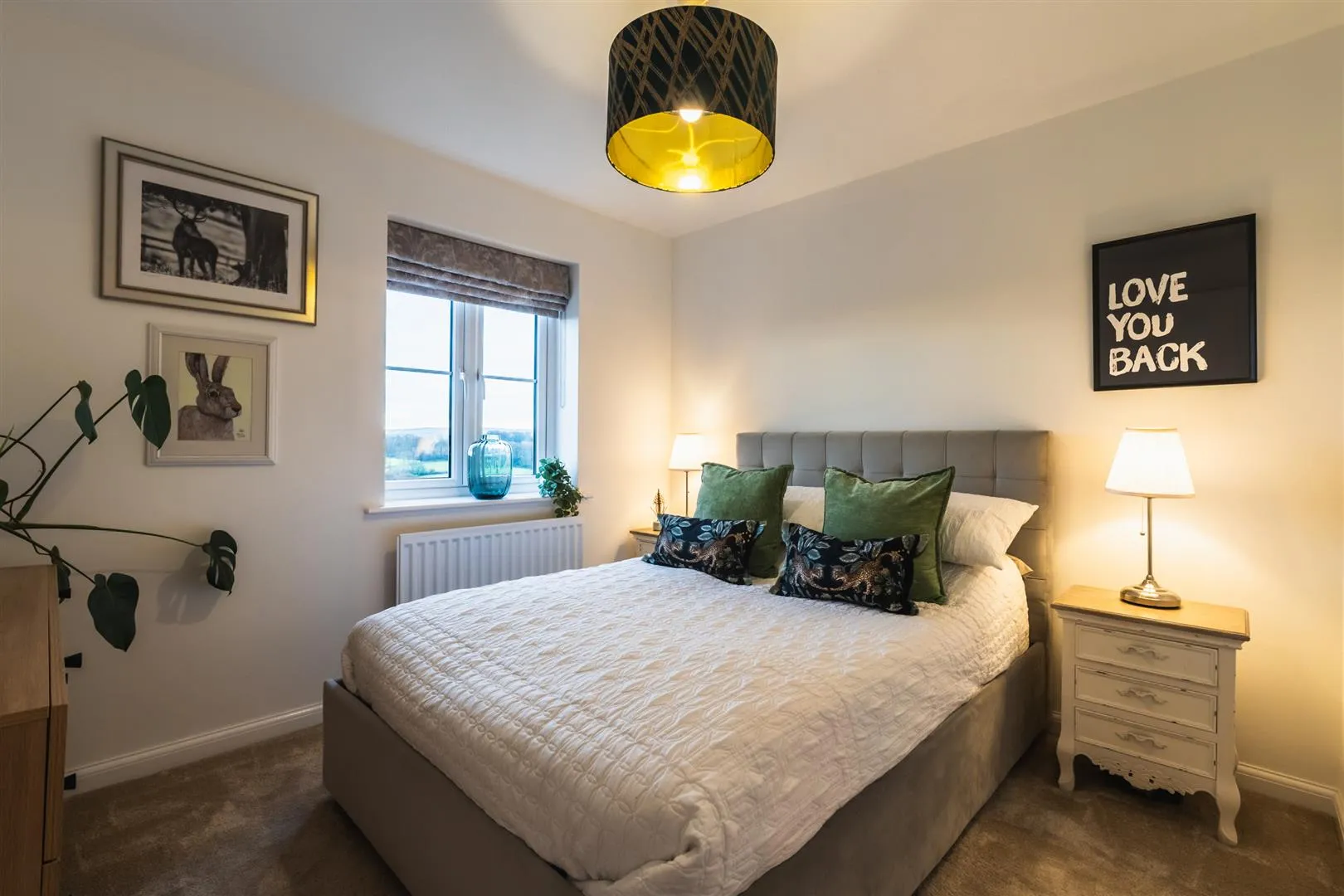 A stunning dual aspect master bedroom with a front facing UPVC double glazed window with superb countryside views, a side facing UPVC double glazed window, flush light point and a central heating radiator. Timber double doors open to the wardrobe and a timber door opens to the master en-suite shower room.