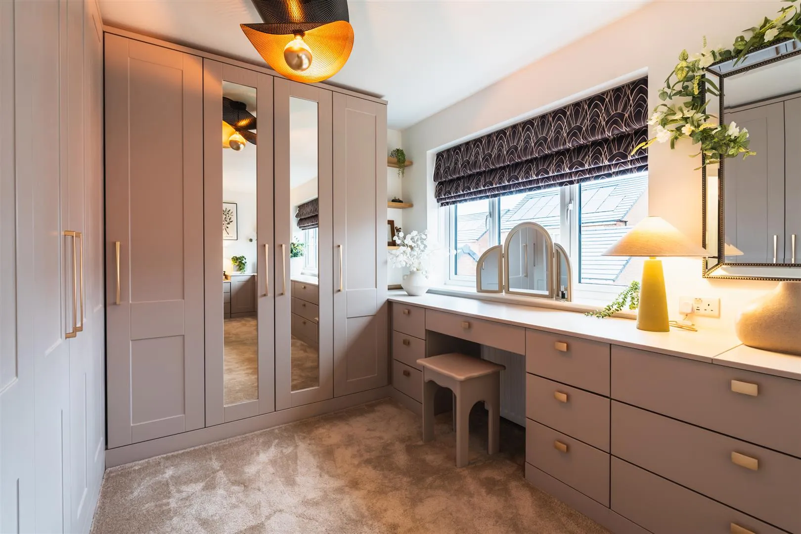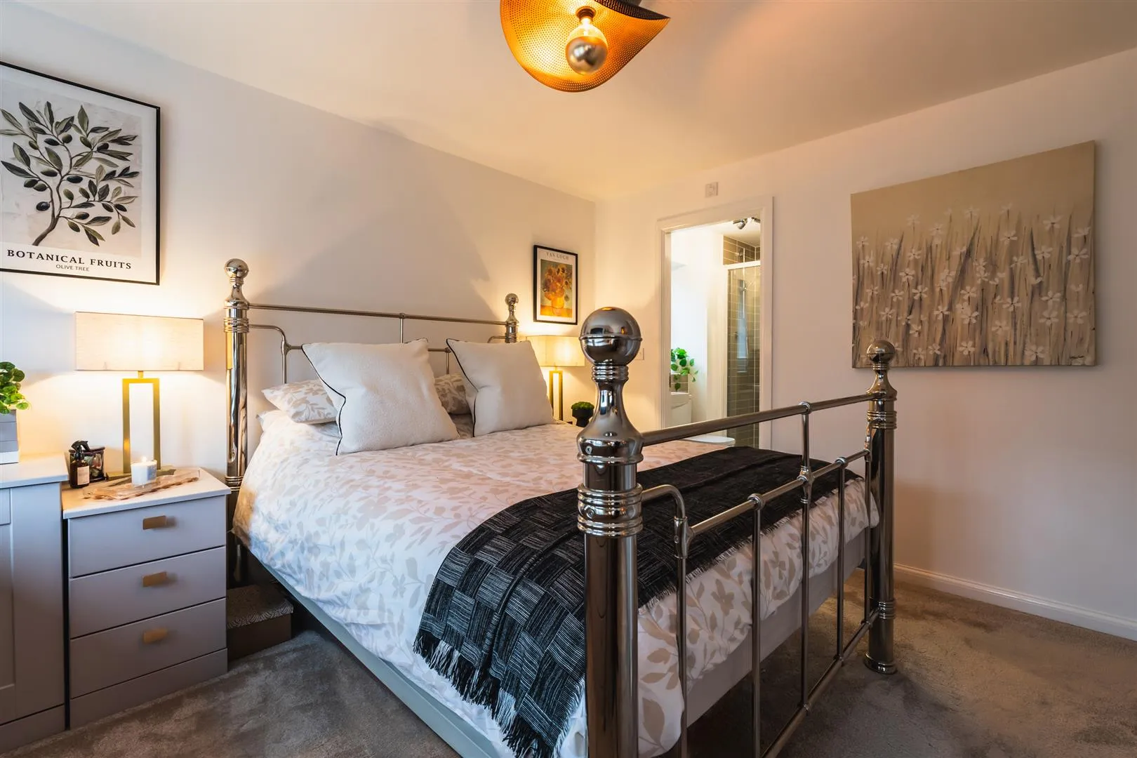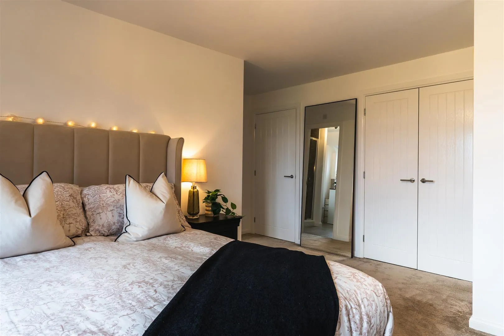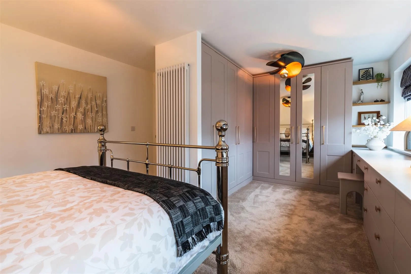 A large double bedroom having rear facing UPVC double glazed windows, pendant light points, and central heating radiators. A variety of fitted furniture includes drawer units, shelving, short and long hanging. A timber door opens to the bedroom 2 en-suite shower room.
