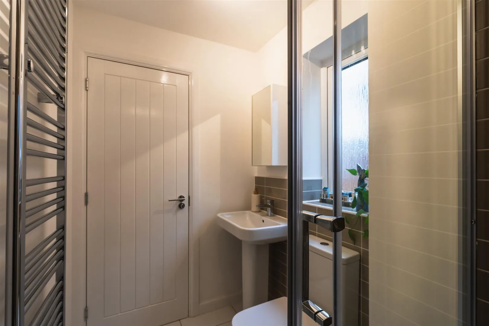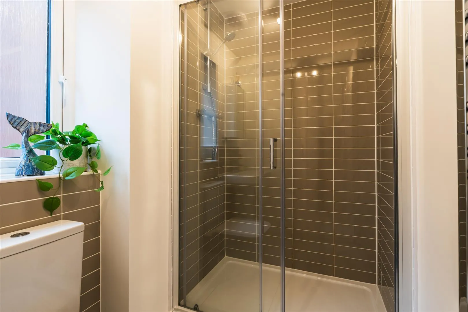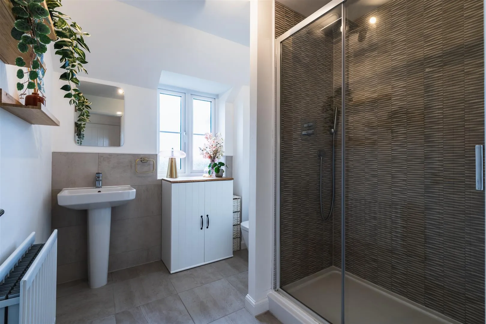 With a front facing UPVC double glazed obscured window, flush light point, extractor fan, central heating radiator and tiled flooring. An Ideal Standard suite in white comprises a low-level WC and a pedestal wash hand basin with a chrome mixer tap. To one corner is a separate fully tiled shower enclosure with a fitted shower, additional hand shower facility and a glazed screen/door.