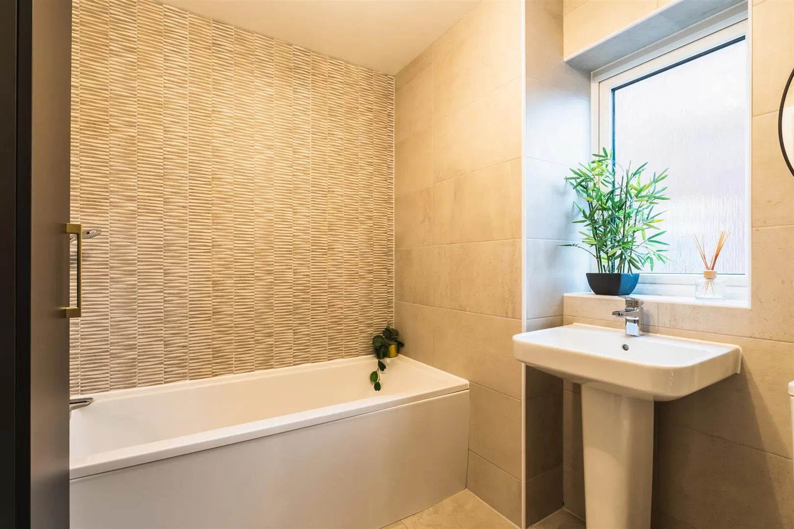 Being fully tiled and having a side facing UPVC double glazed obscured window, flush light point, extractor fan and a chrome heated towel rail. An Ideal Standard suite in white comprises a low-level WC and a pedestal wash hand basin with a chrome mixer tap. There is a panelled bath with a chrome mixer tap and an additional hand shower facility.