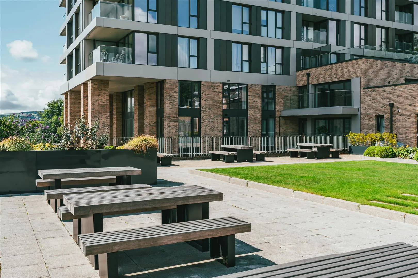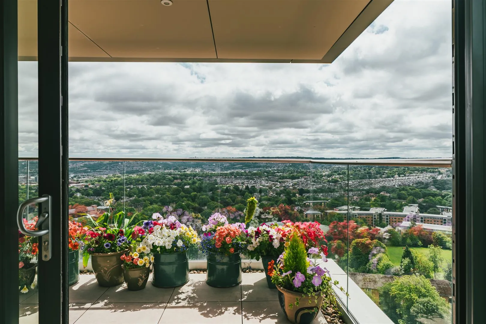 A sizeable flagged terrace with recessed lighting, enclosed by glazed balustrading with stainless steel hand rails. The balcony enjoys a south-facing aspect and magnificent views across Sheffield to the Mayfield Valley and the Pennine hills beyond.