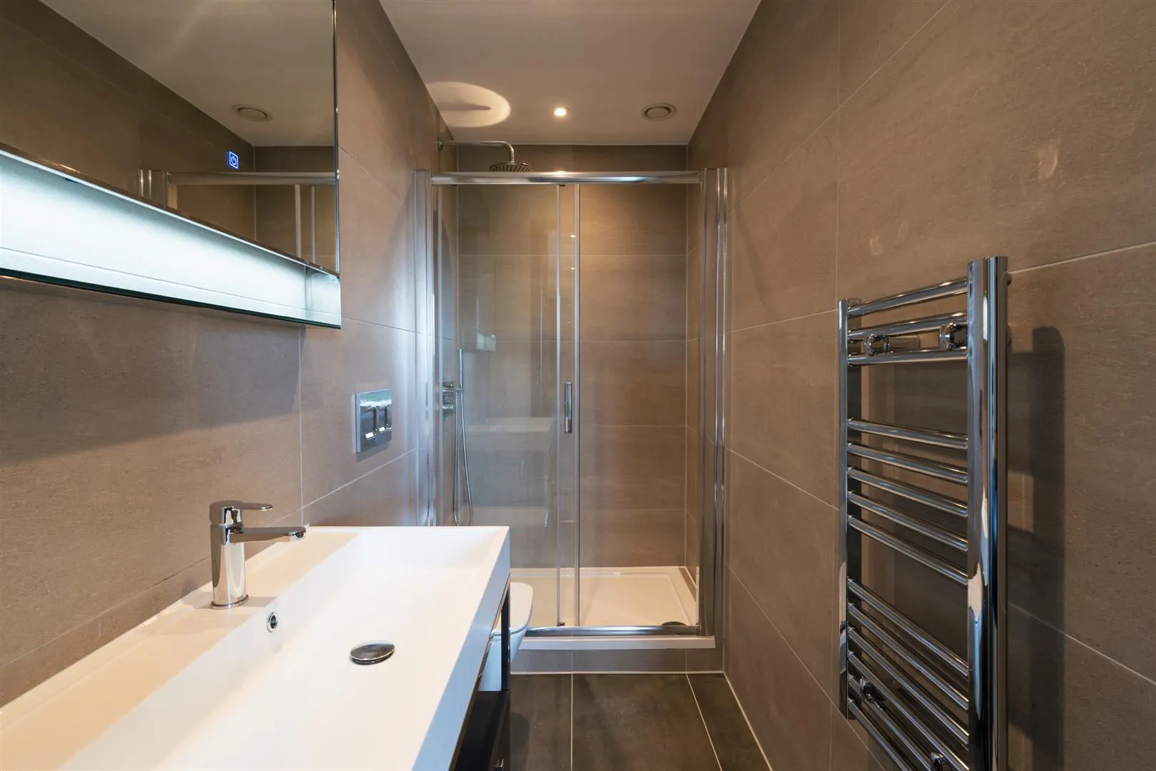Being fully tiled and having recessed lighting, MVHR vent, illuminated vanity mirror and a chrome heated towel rail. There is a suite in white, which comprises a wall mounted WC and a wash hand basin with a chrome mixer tap and storage beneath. To one end is a full-width, walk-in shower enclosure with a fitted rain head shower, an additional hand shower facility and a glazed screen/door.