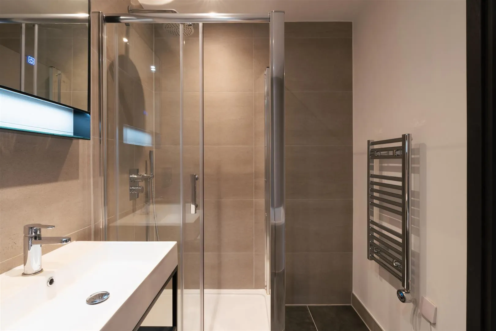 A contemporary family bathroom that has three fully tiled walls. Having recessed lighting, MVHR vent, an illuminated vanity mirror and a chrome heated towel rail. There is a suite in white, which comprises a wall mounted WC and a wash hand basin with a chrome mixer tap and storage beneath. Also having a panelled bath with a chrome mixer tap. To one corner, is a shower enclosure with a fitted rain head shower, an additional hand shower facility and a glazed screen/door.