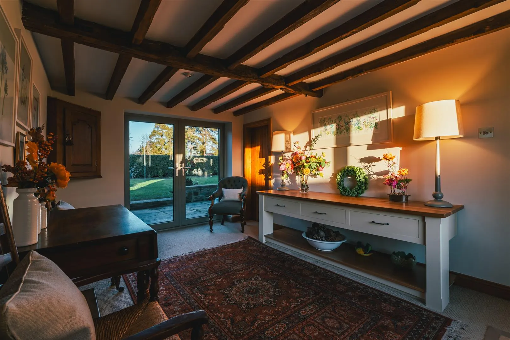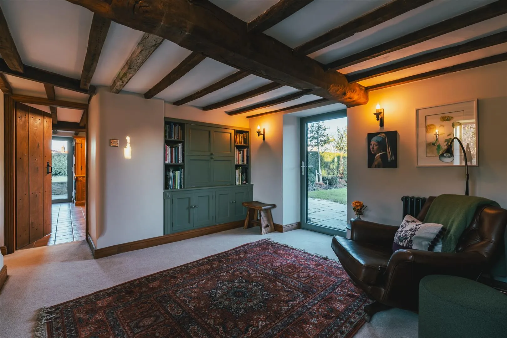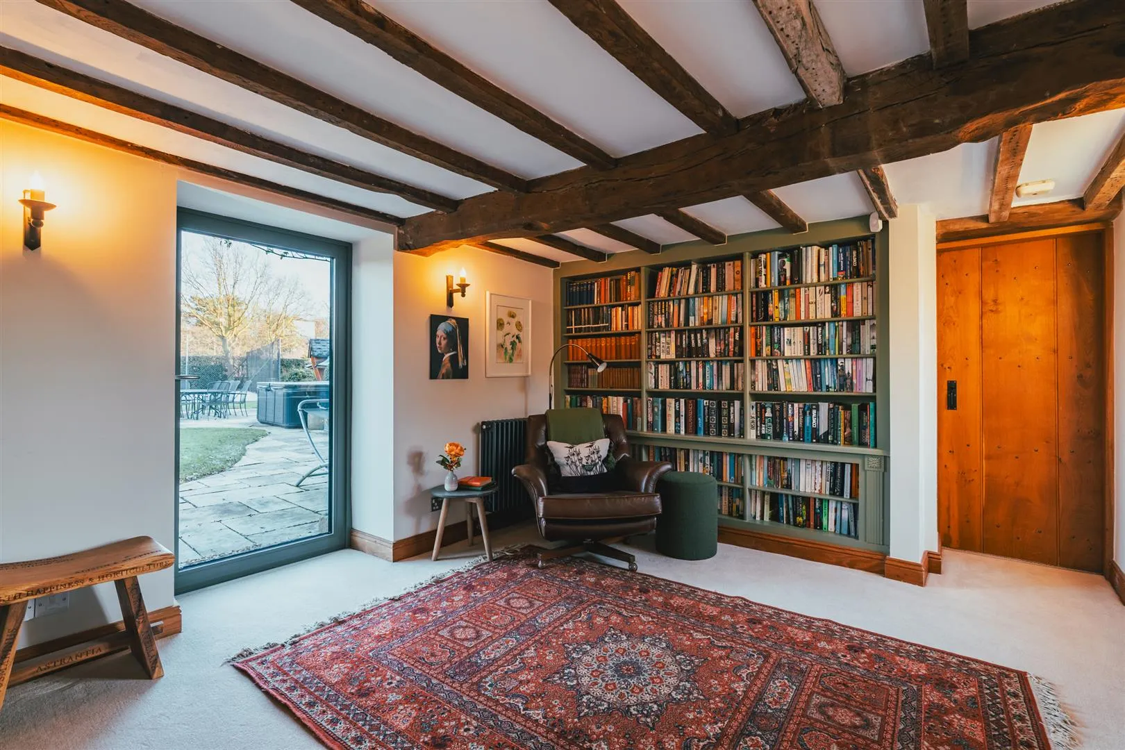A tranquil area for relaxation with a side facing aluminium double glazed window, exposed timber beams, wall mounted light points and a central heating radiator. There is a range of fitted book shelving and cupboards. Oak doors open to the second kitchen and sitting room. An aluminium door with a double glazed panel opens to the right side of the property.