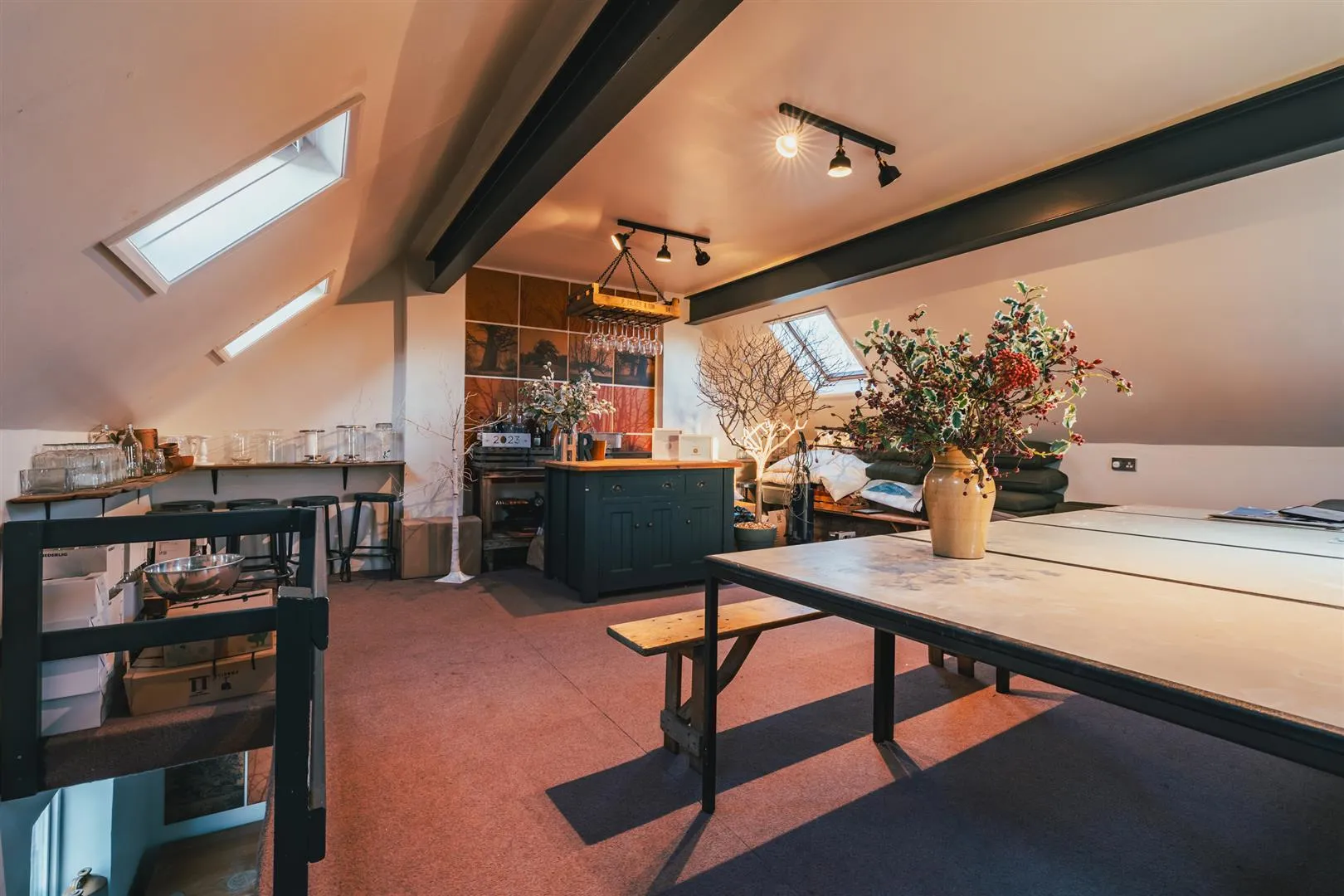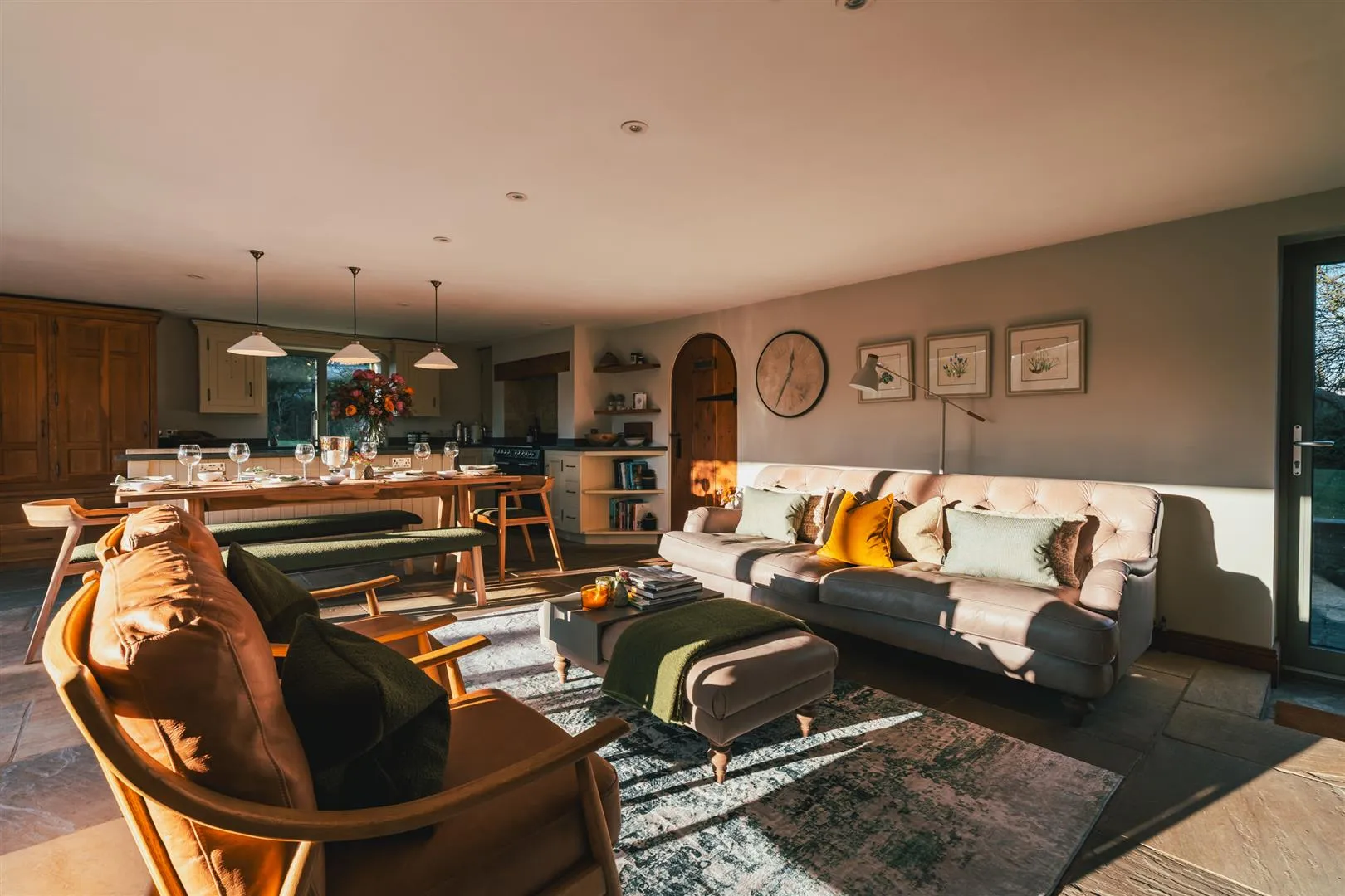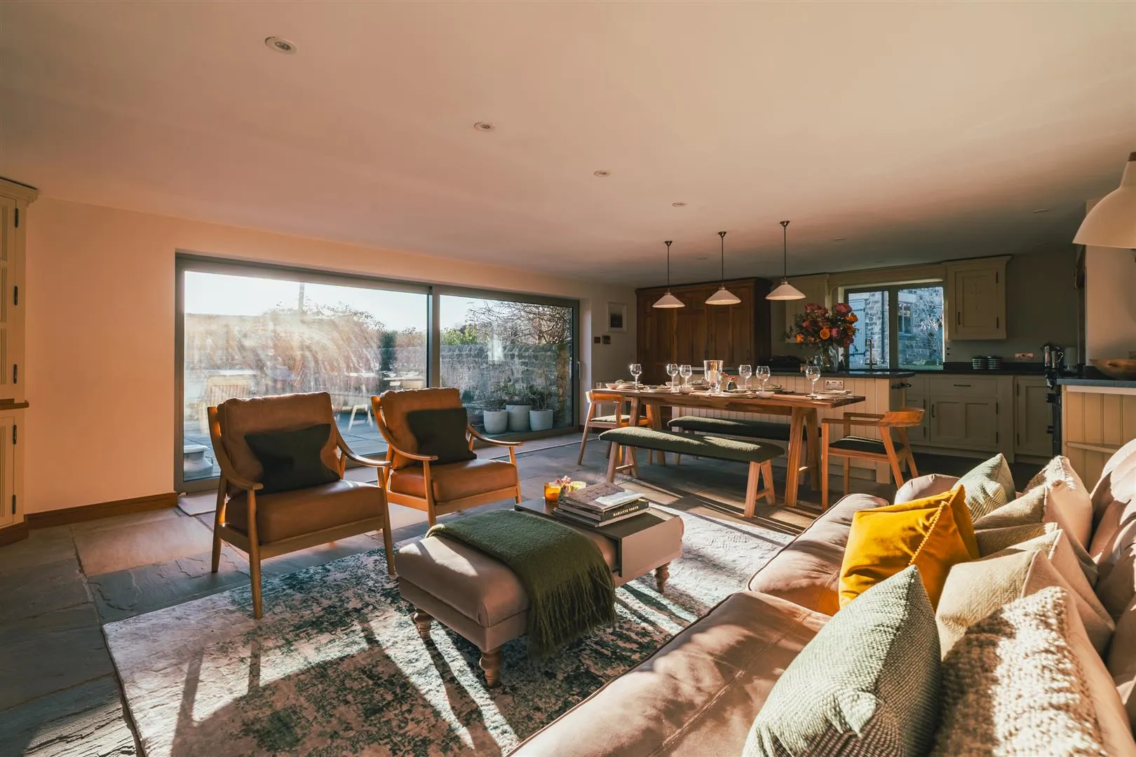 A tranquil area for relaxation with a side facing aluminium double glazed window, exposed timber beams, wall mounted light points and a central heating radiator. There is a range of fitted book shelving and cupboards. Oak doors open to the second kitchen and sitting room. An aluminium door with a double glazed panel opens to the right side of the property.