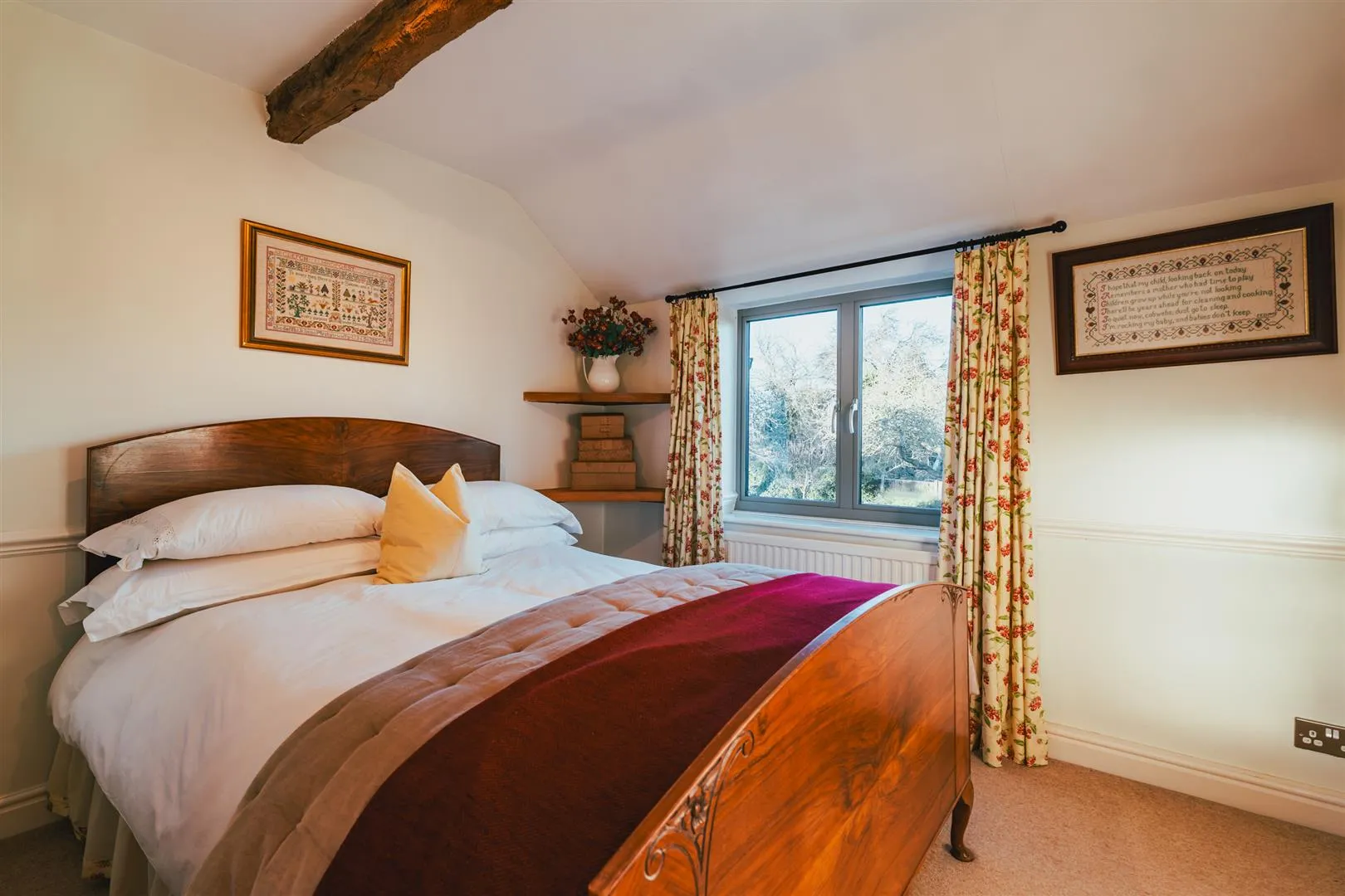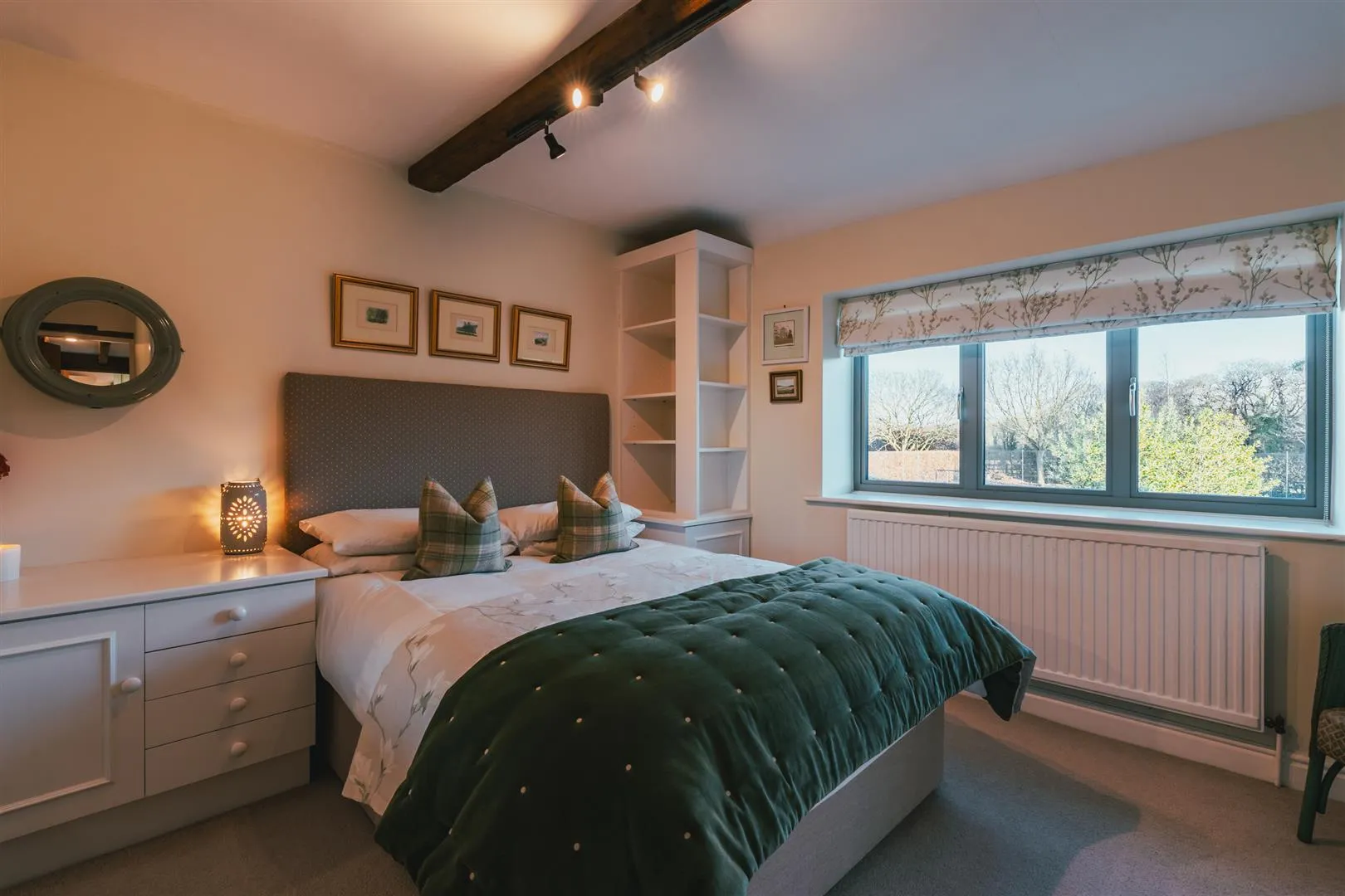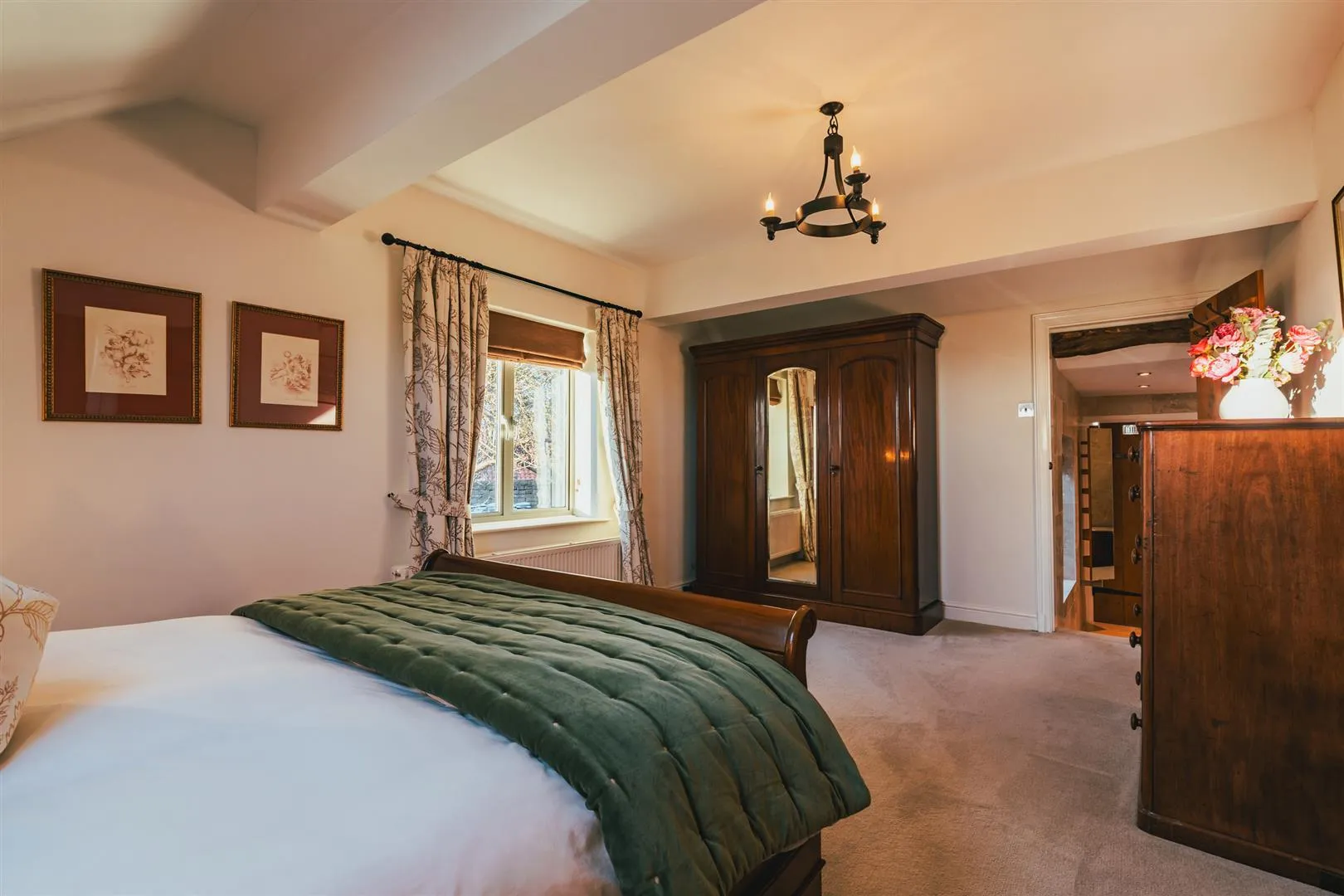 A good-sized double bedroom with a rear facing aluminium double glazed window, exposed timber beam, flush light point, dado rail, central heating radiator and a telephone point. An oak door opens to the bedroom 4 walk-in wardrobe. Access can be gained to a loft space.