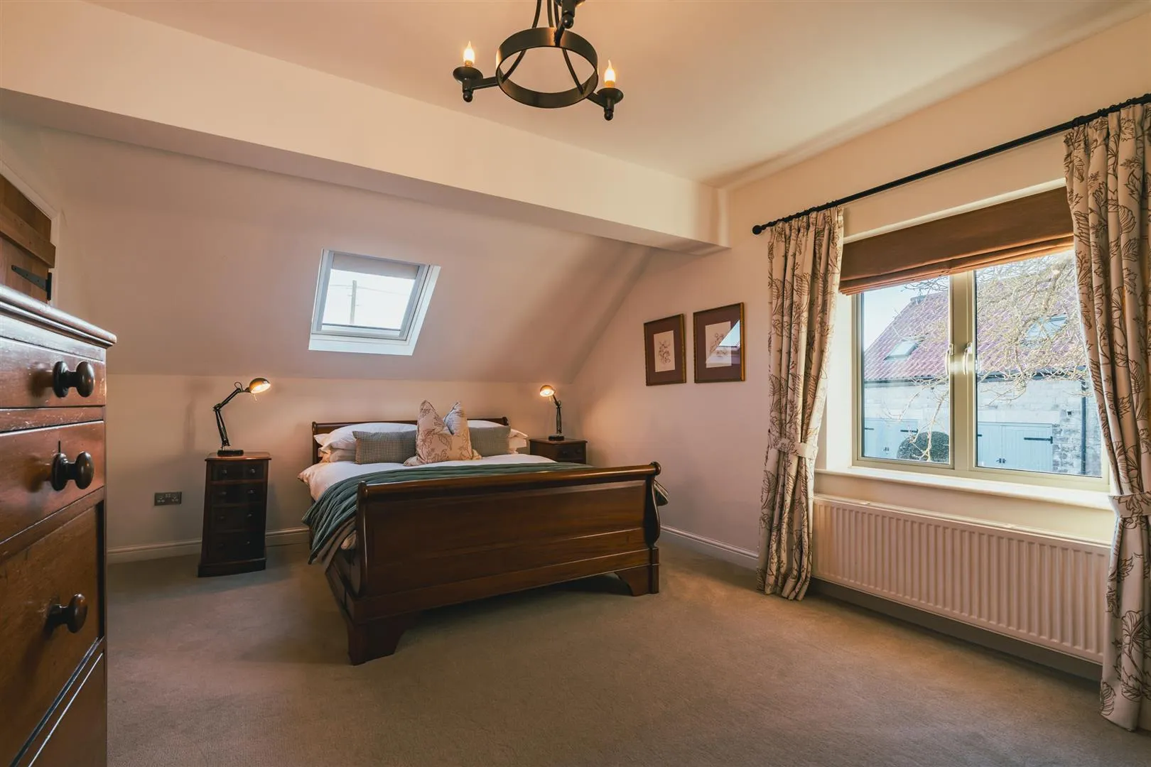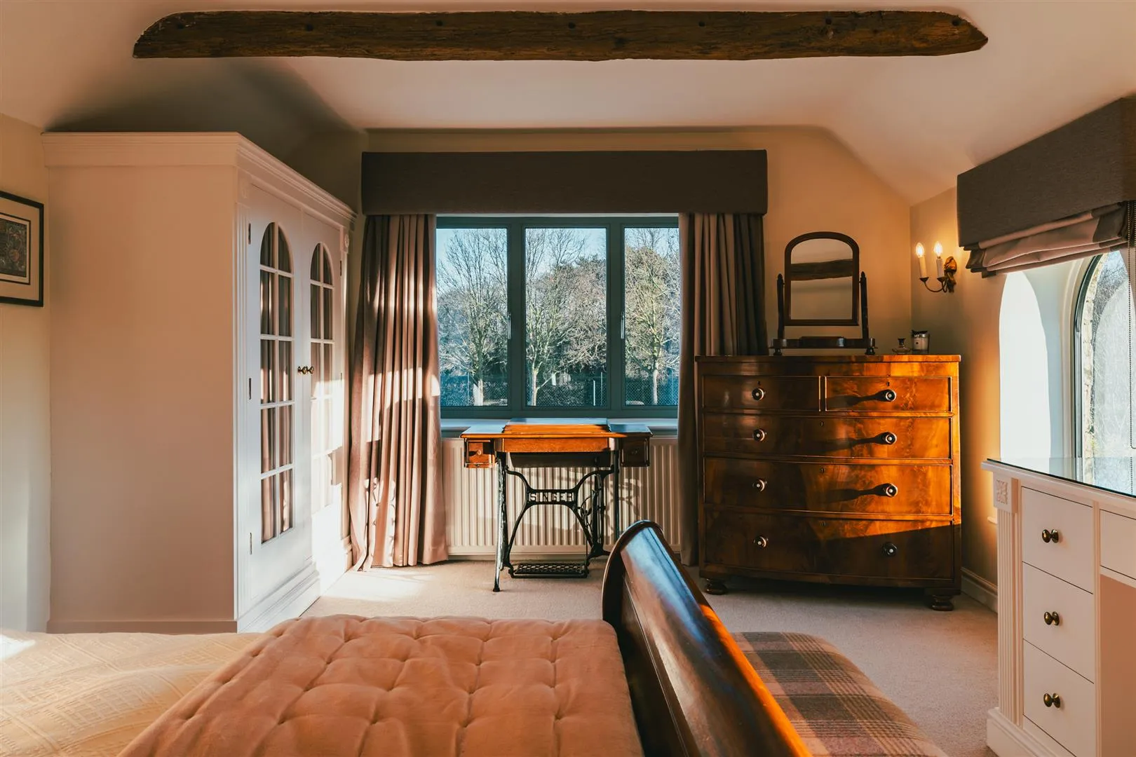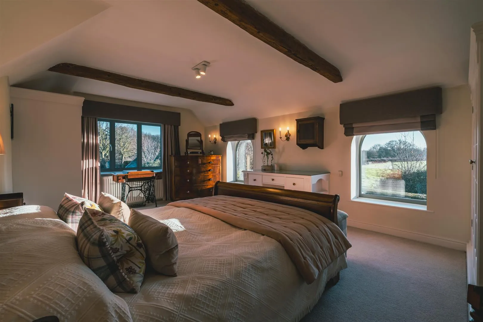 A good-sized double bedroom with a rear facing aluminium double glazed window, exposed timber beam, flush light point, dado rail, central heating radiator and a telephone point. An oak door opens to the bedroom 4 walk-in wardrobe. Access can be gained to a loft space.