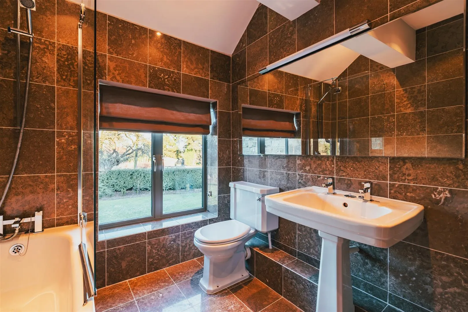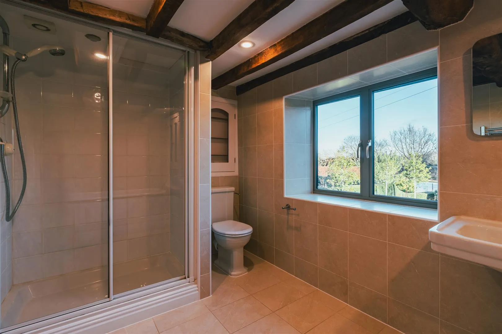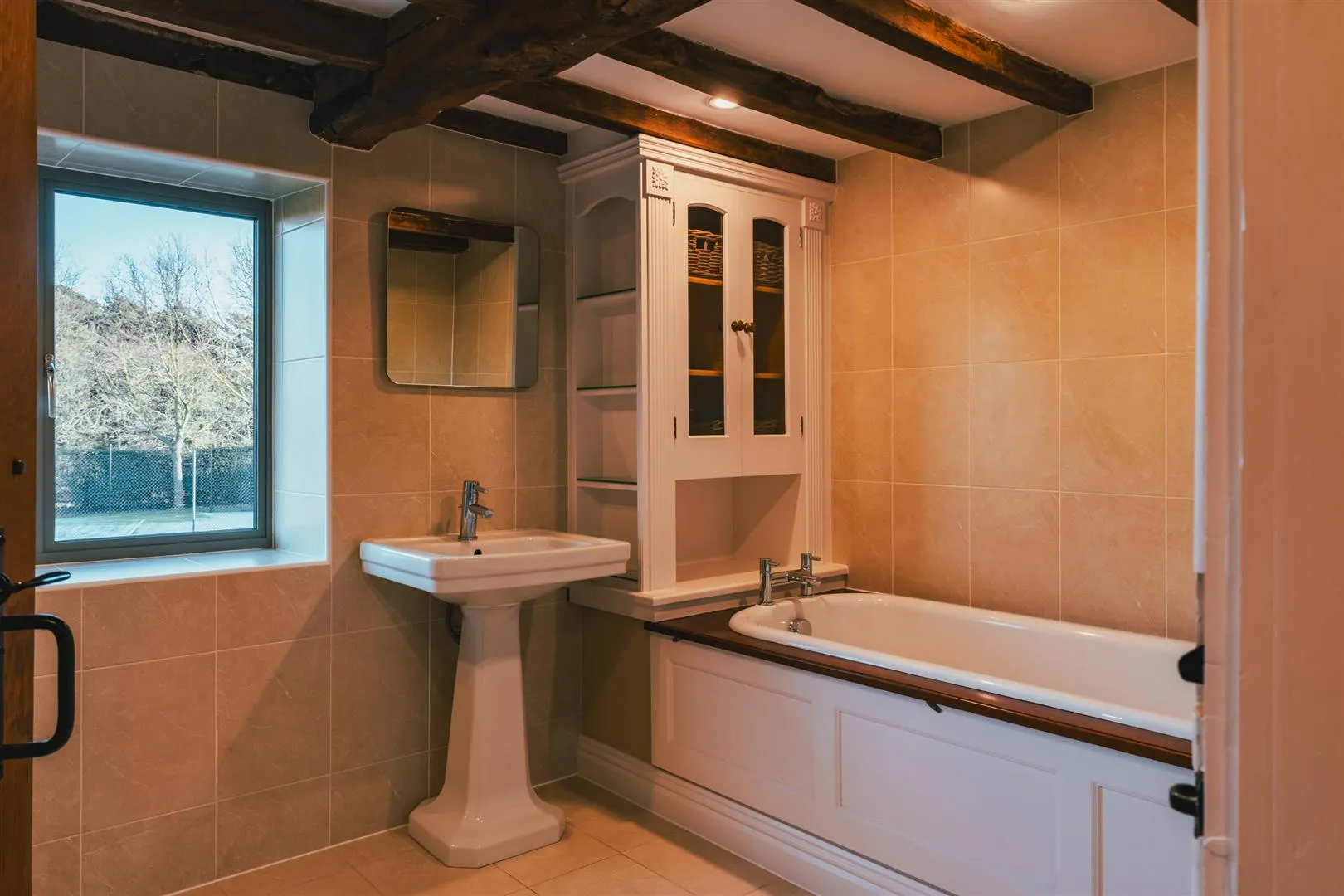 Being fully tiled and having a side facing aluminium double glazed window, exposed timber beams, extractor fan, recessed lighting and a chrome heated towel rail. A suite in white comprises a low-level WC and a pedestal wash hand basin with a chrome mixer tap and a vanity mirror above. Also having an inset bath with a chrome mixer tap and a built-in cupboard above with shelving. To one corner is a separate shower enclosure with a fitted shower and a glazed screen/door.