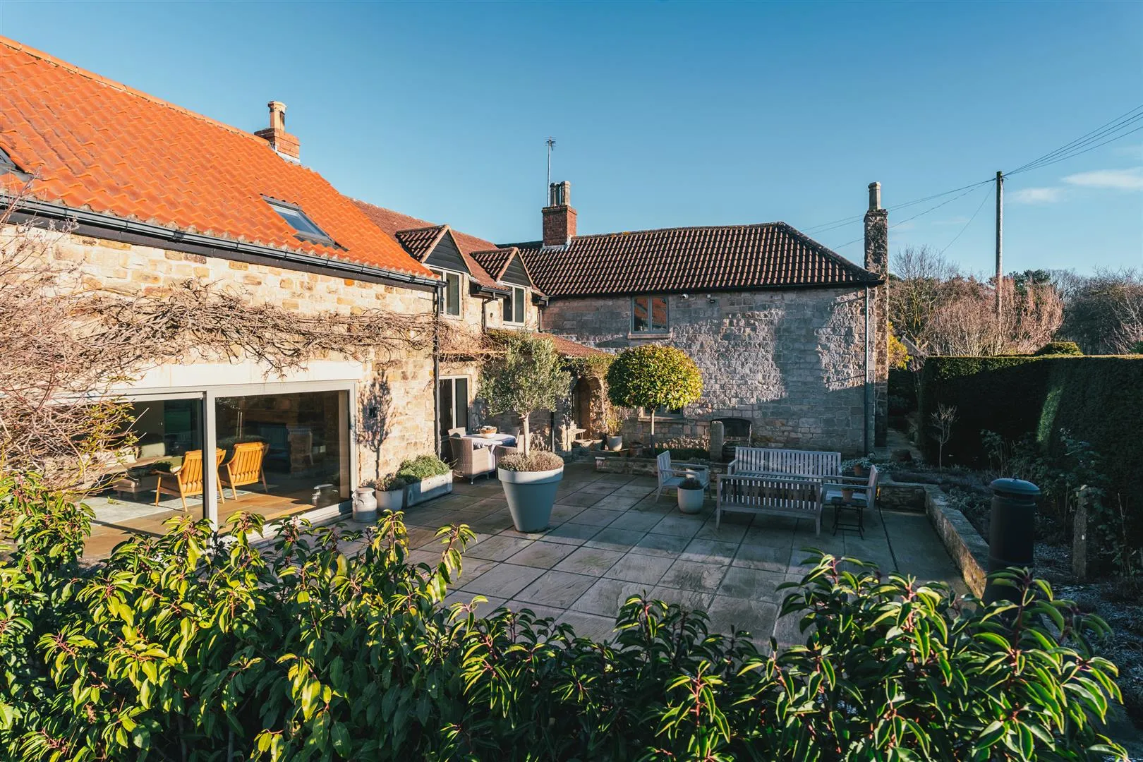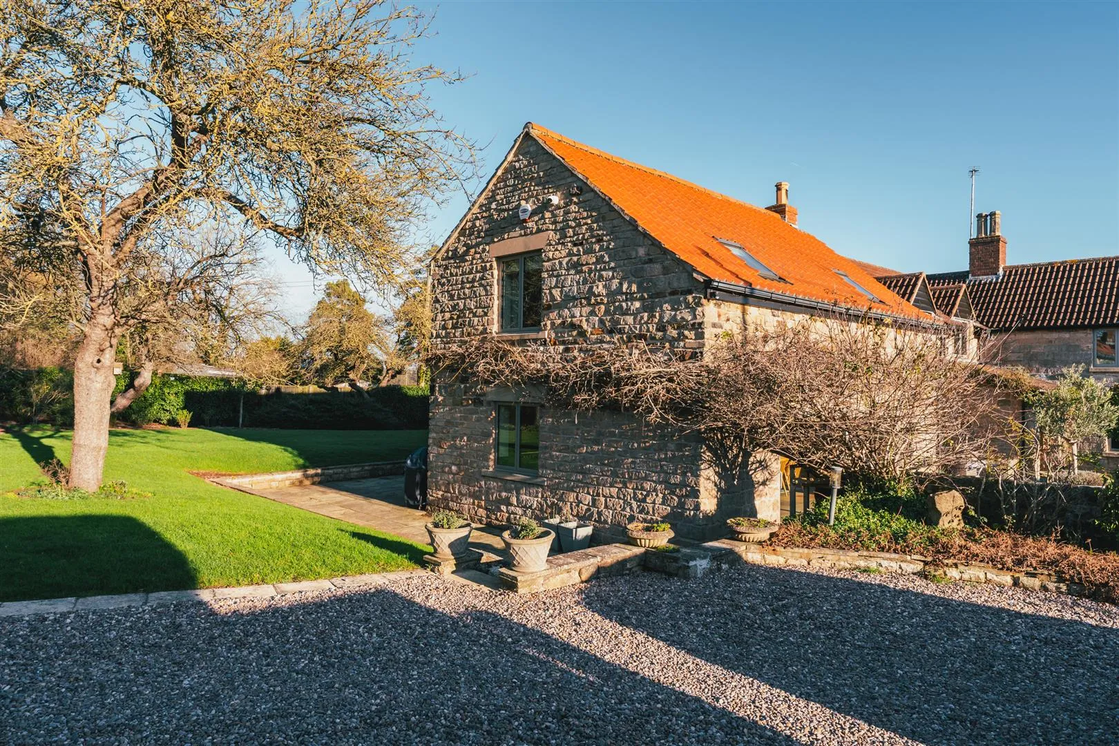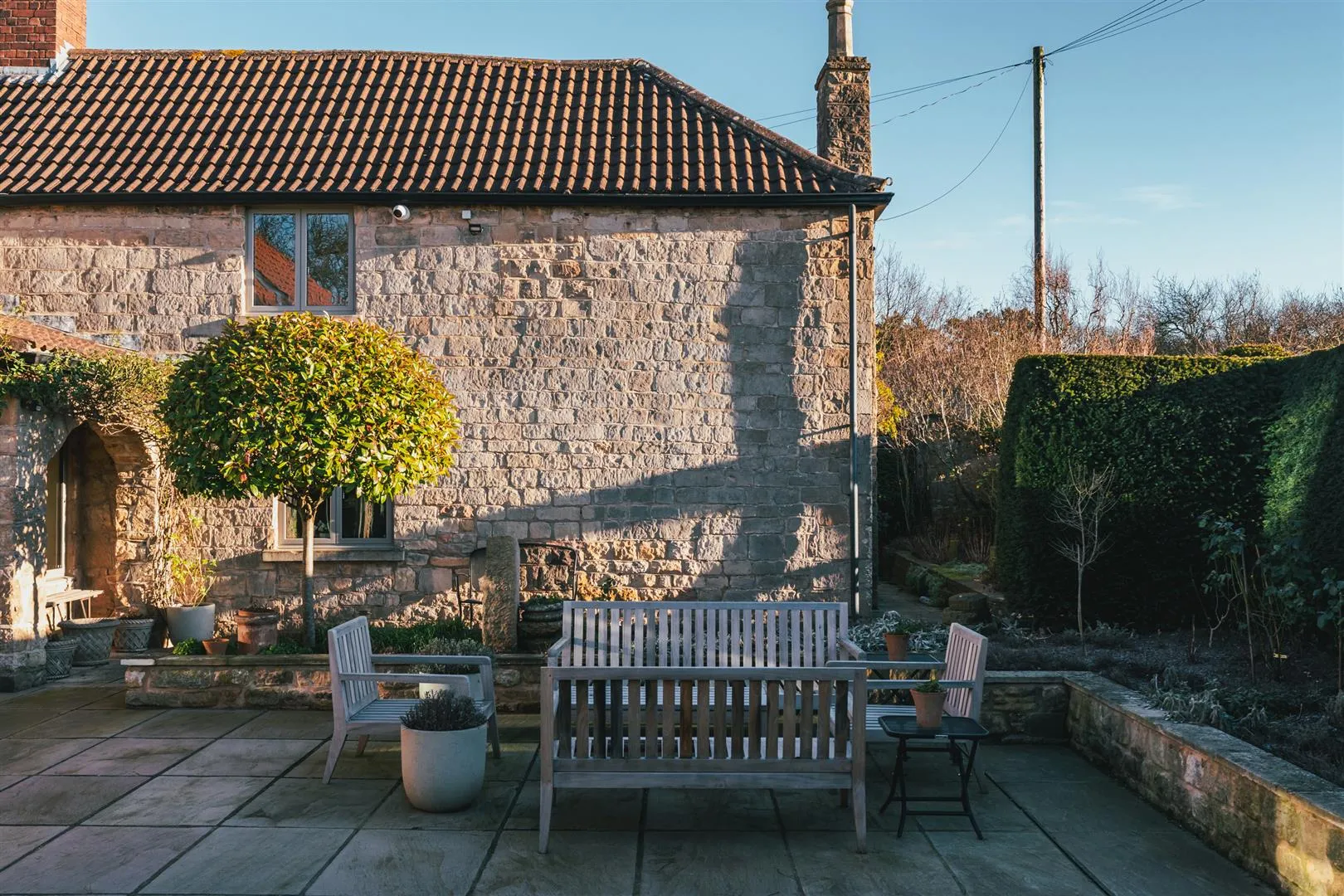 To the front is a beautiful stone flagged seating terrace of substantial proportions, making it ideal for outdoor dining and entertaining and having the benefit of a south-facing aspect. There is external power points and exterior lighting. Around the perimeter of the terrace are raised borders that are neatly planted with an array of ornamental shrubs, flowers and trees. Access can be gained to the living kitchen. A stone flagged path with a raised stone planter leads around the edge of the house and to a timber pedestrian gate within a yew hedge which opens to the lane.