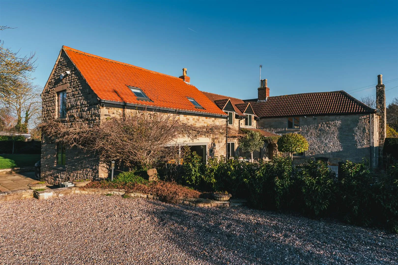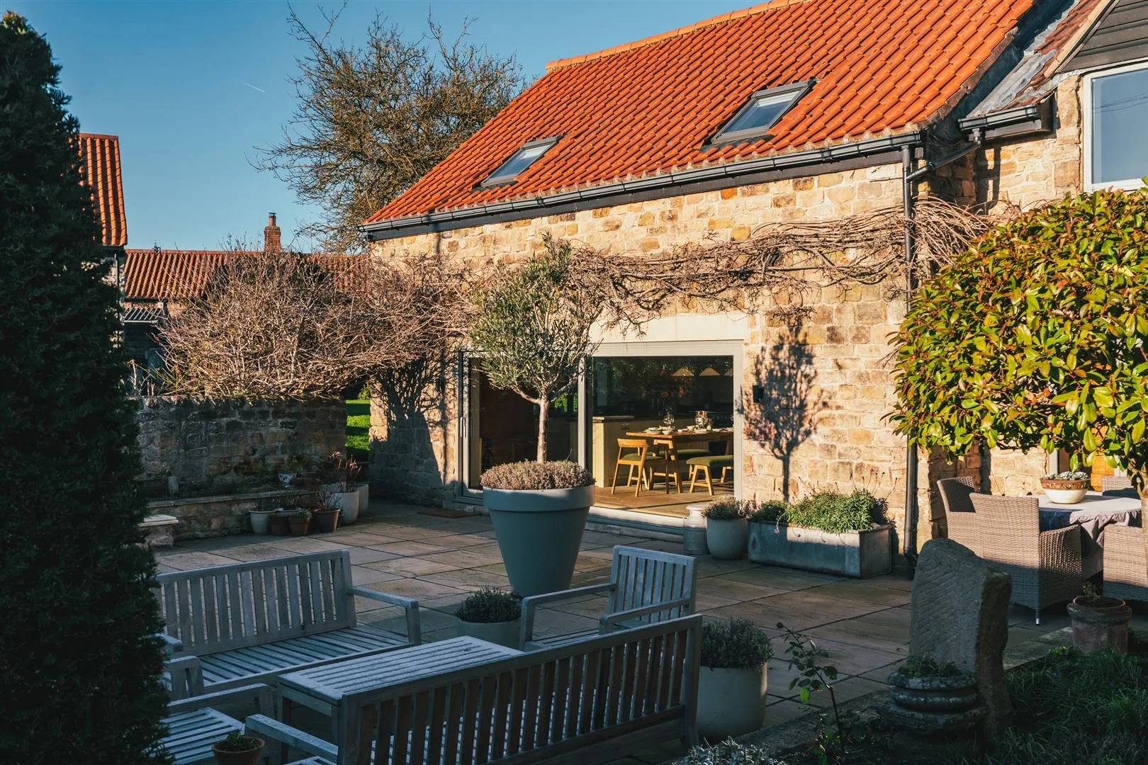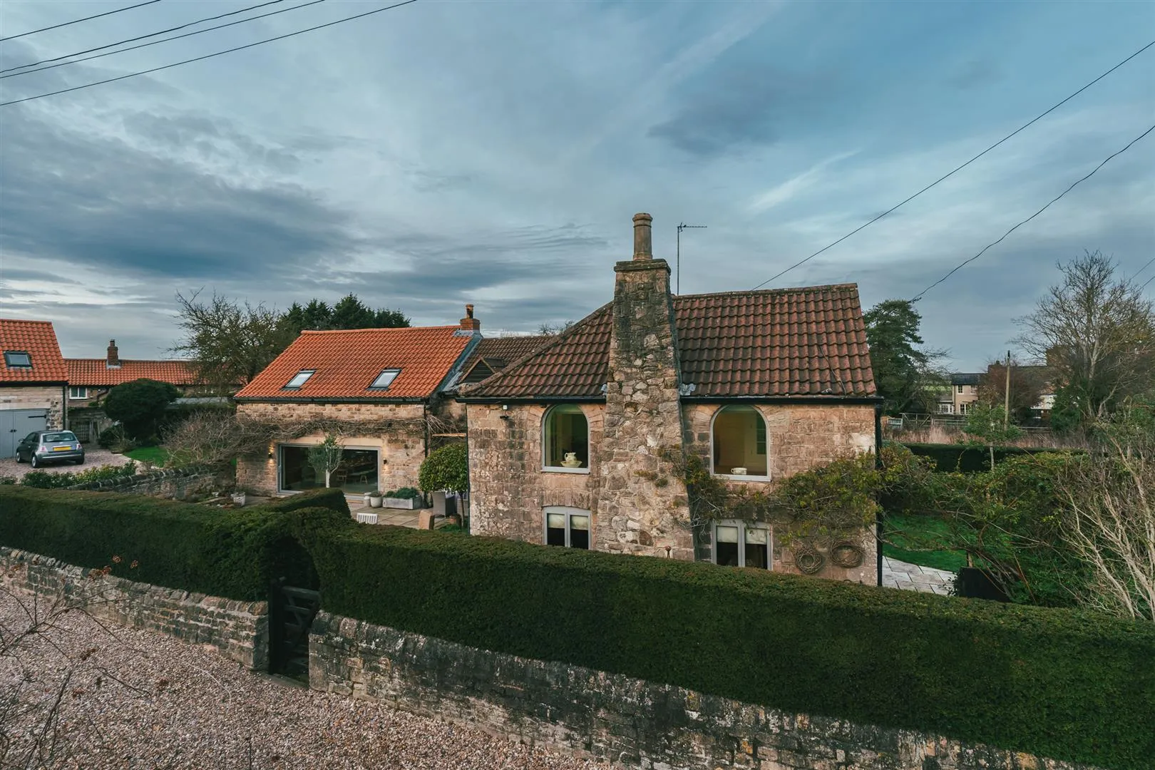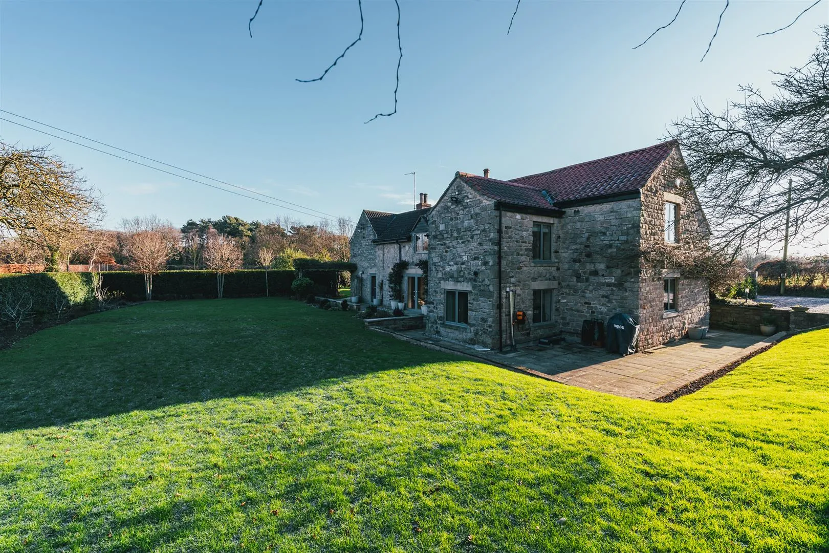 To the front is a beautiful stone flagged seating terrace of substantial proportions, making it ideal for outdoor dining and entertaining and having the benefit of a south-facing aspect. There is external power points and exterior lighting. Around the perimeter of the terrace are raised borders that are neatly planted with an array of ornamental shrubs, flowers and trees. Access can be gained to the living kitchen. A stone flagged path with a raised stone planter leads around the edge of the house and to a timber pedestrian gate within a yew hedge which opens to the lane.