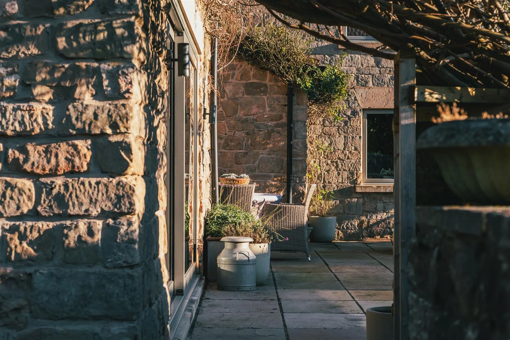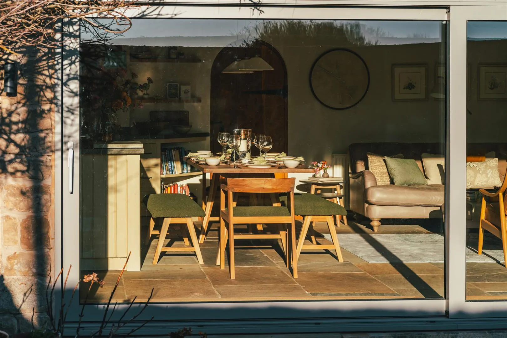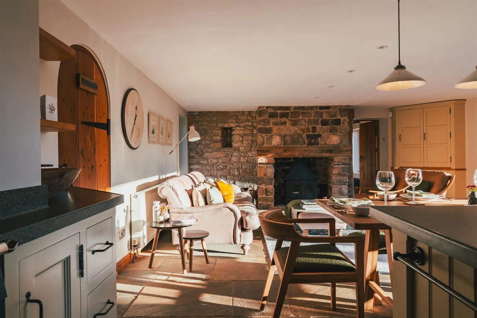 Upon entering Lilac Cottage, you are greeted by the large, open plan living kitchen. Allowing natural light to adorn the room, an oversized aluminium sliding door provides a seamless transition from the living kitchen to the south-facing terrace at the front of the home. An exposed stone wall and fireplace featuring a Yeoman log burner create a rustic focal point and the functional kitchen area makes every day cooking and dining effortless. Just off the kitchen is a larder, which incorporates additional cupboard and worktop space for storage and food preparation.