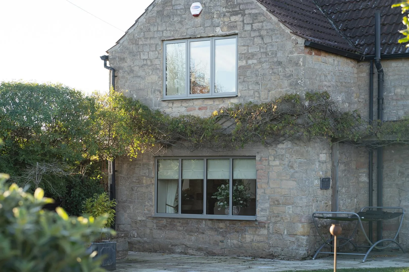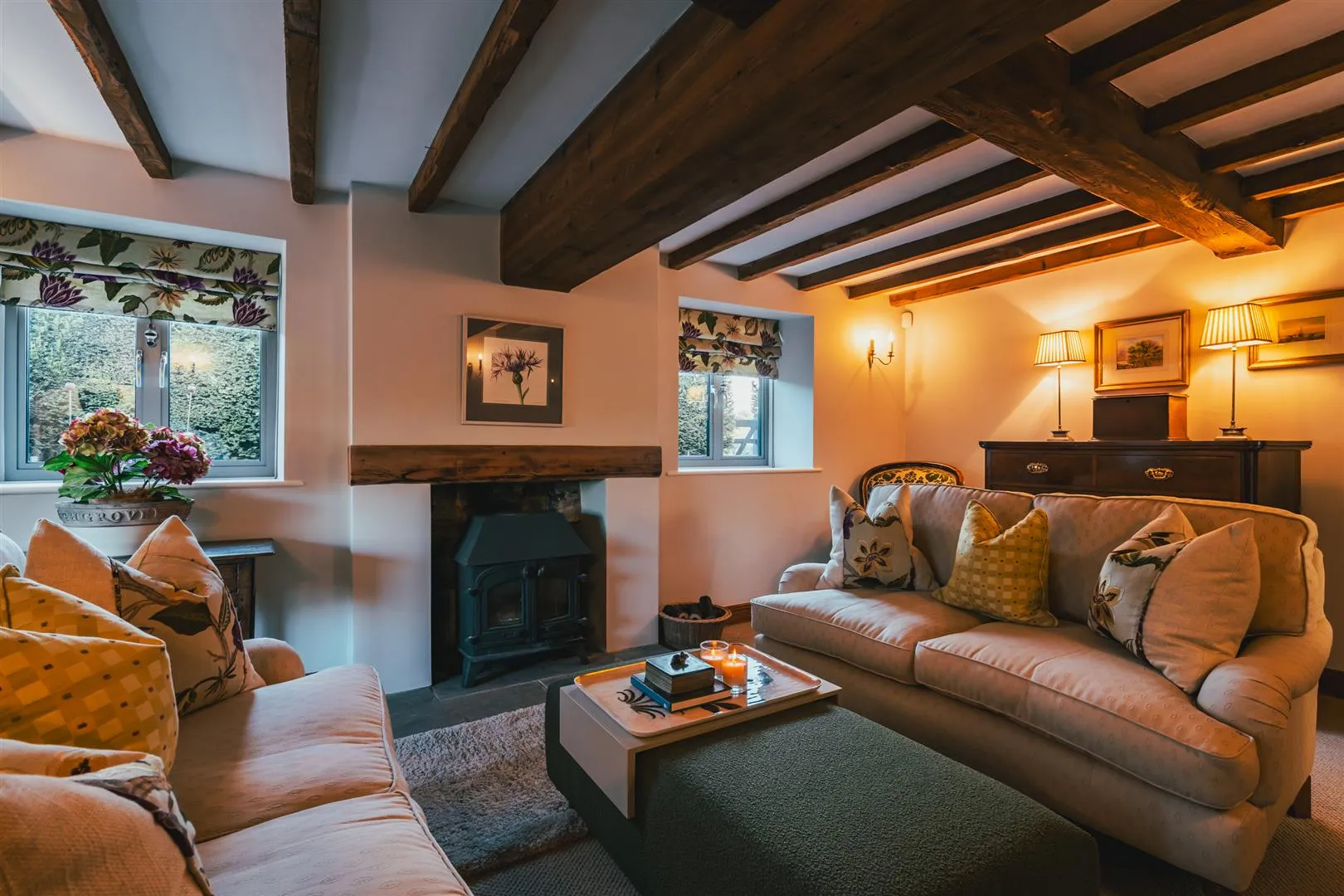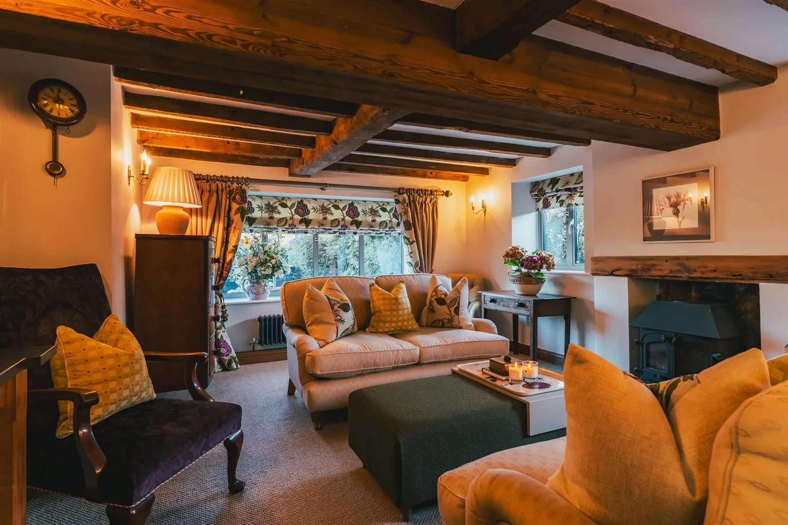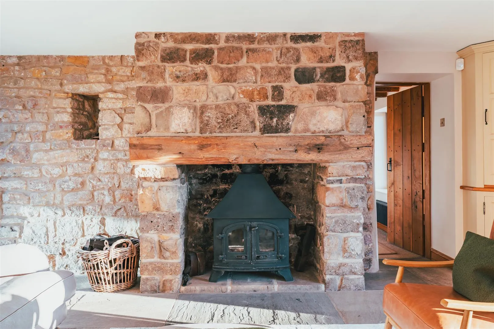 A homely reception room with front facing aluminium double glazed windows, side facing aluminium double glazed panels, exposed timber beams, wall mounted light points and central heating radiators. The focal point of the room is the Yeoman log burner with an oak mantel and a stone hearth.