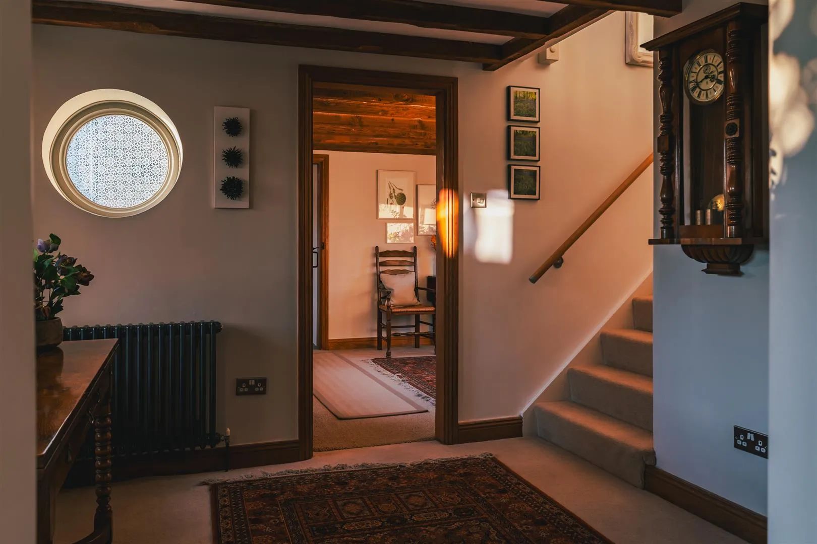 Having a front facing aluminium double glazed picture window, side facing partially obscured circular window, exposed timber beams, recessed light point and a central heating radiator. An oak door opens to the WC and a wide opening leads to the library.