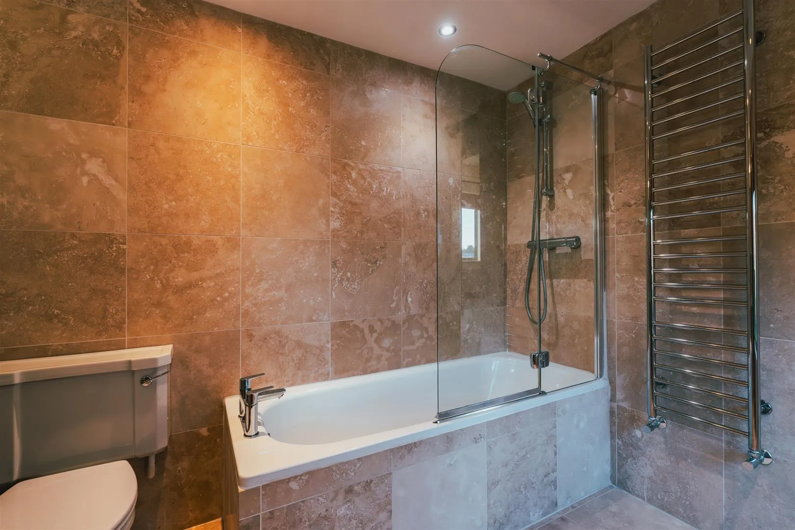 Being fully tiled and having a rear facing aluminium double glazed window, recessed lighting, chrome heated towel rail, wall mounted light point and under floor heating. A suite in white comprises a low-level WC and a pedestal wash hand basin with traditional chrome taps. To one corner is a panelled bath with a chrome mixer tap, a hand shower facility and a folding glazed screen. Access can also be gained to a loft space.