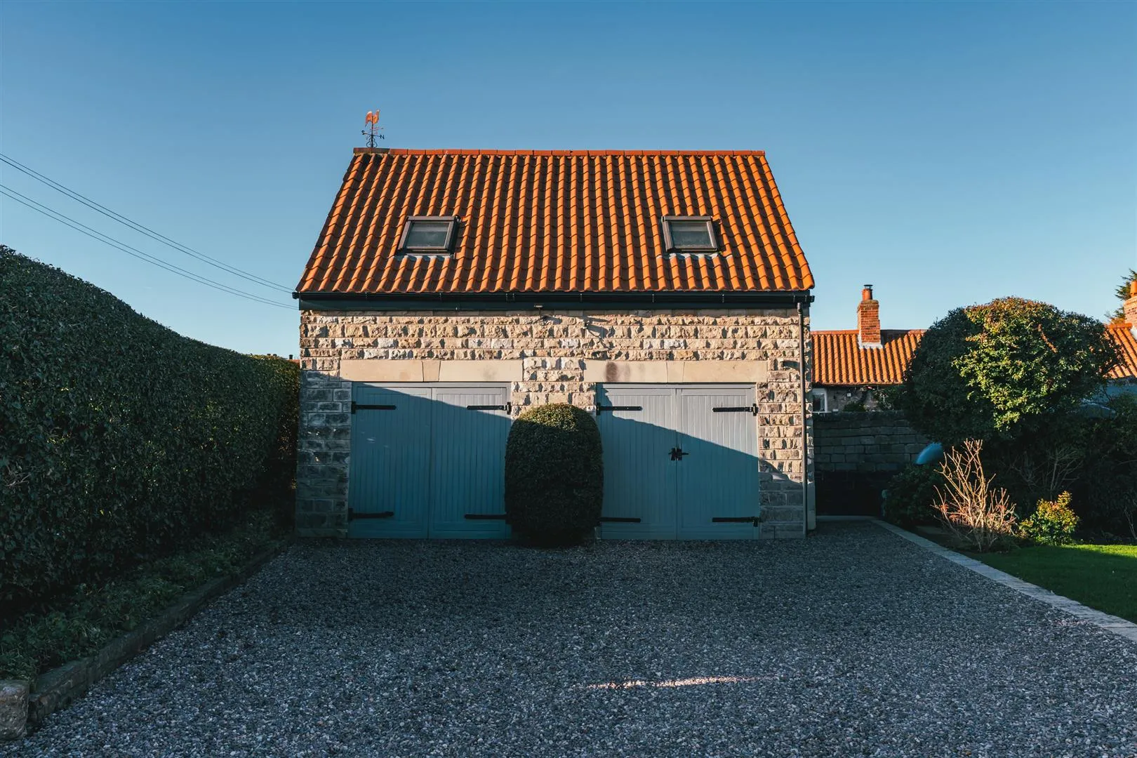 From the gravelled lane, an opening within stone walling leads to a gravelled driveway at the front of the property, which provides parking for four vehicles. The driveway has exterior lighting and planted borders. Access can be gained to the detached double garage. To one side of the garage, the oil tank is housed and there is a storage shed, wood store and an external power point.