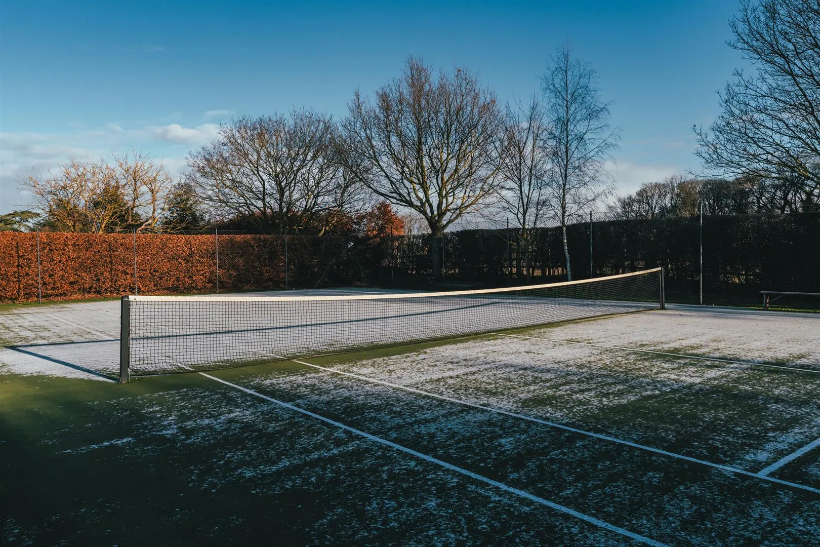 Fully enclosed by metal link sports fencing with a top-quality carpeted surface fully fitted and maintained by Anglian Tennis Courts.
