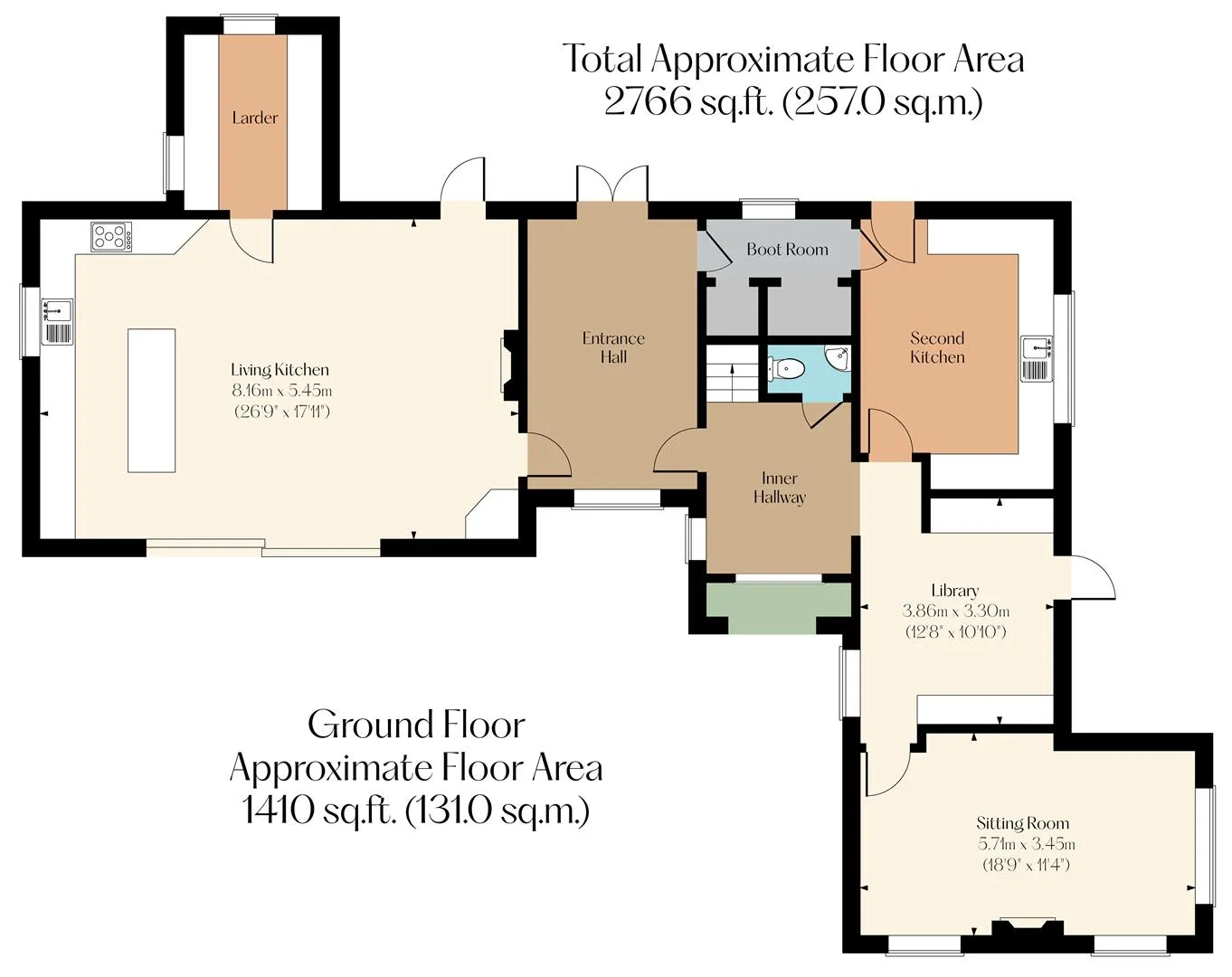 The property briefly comprises of on the ground floor: Living kitchen, larder, entrance hall, boot room, inner hallway, WC, library, second kitchen and sitting room.