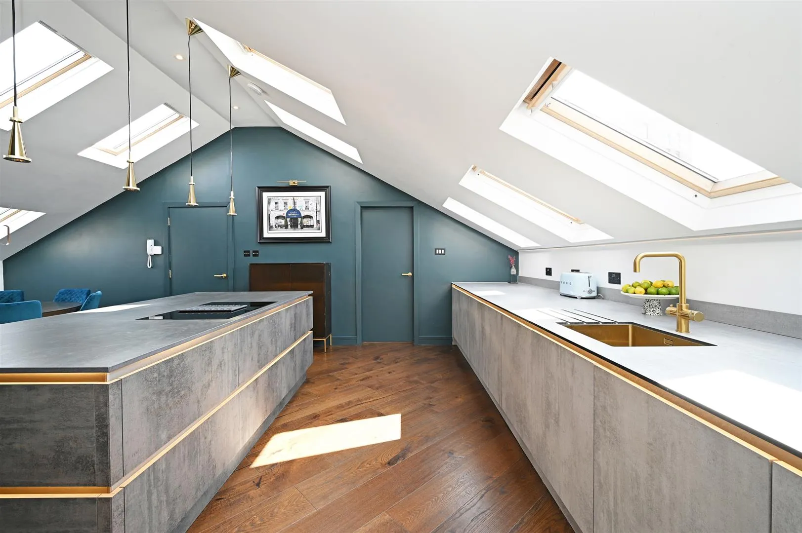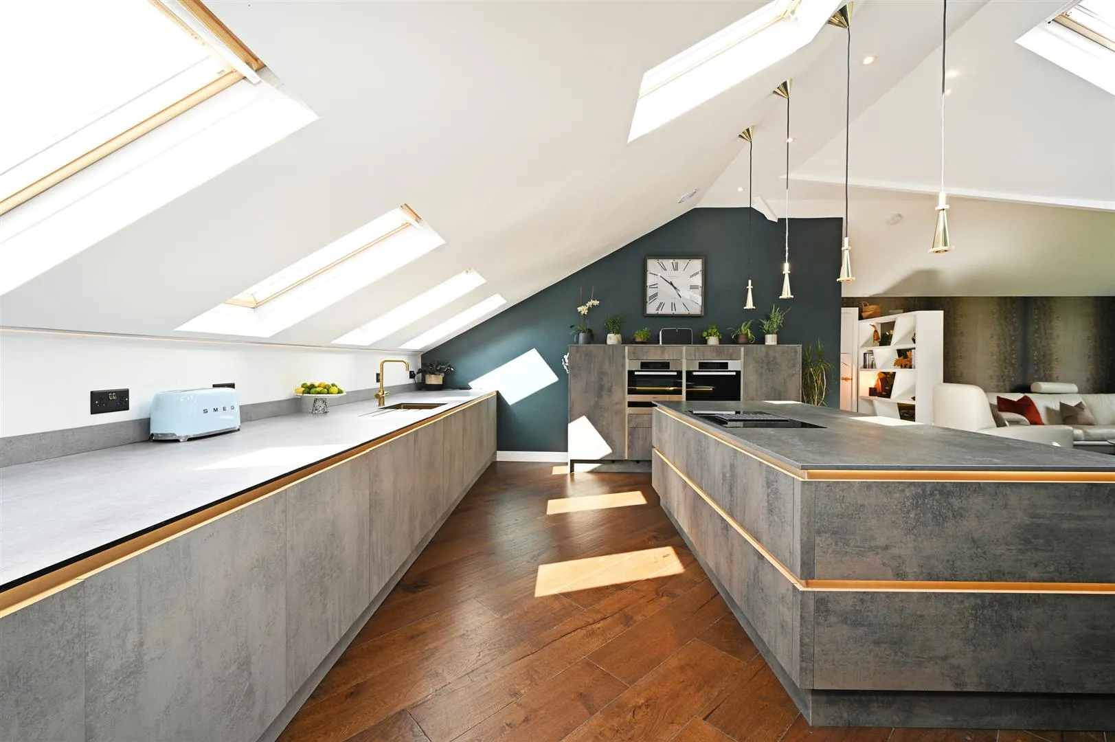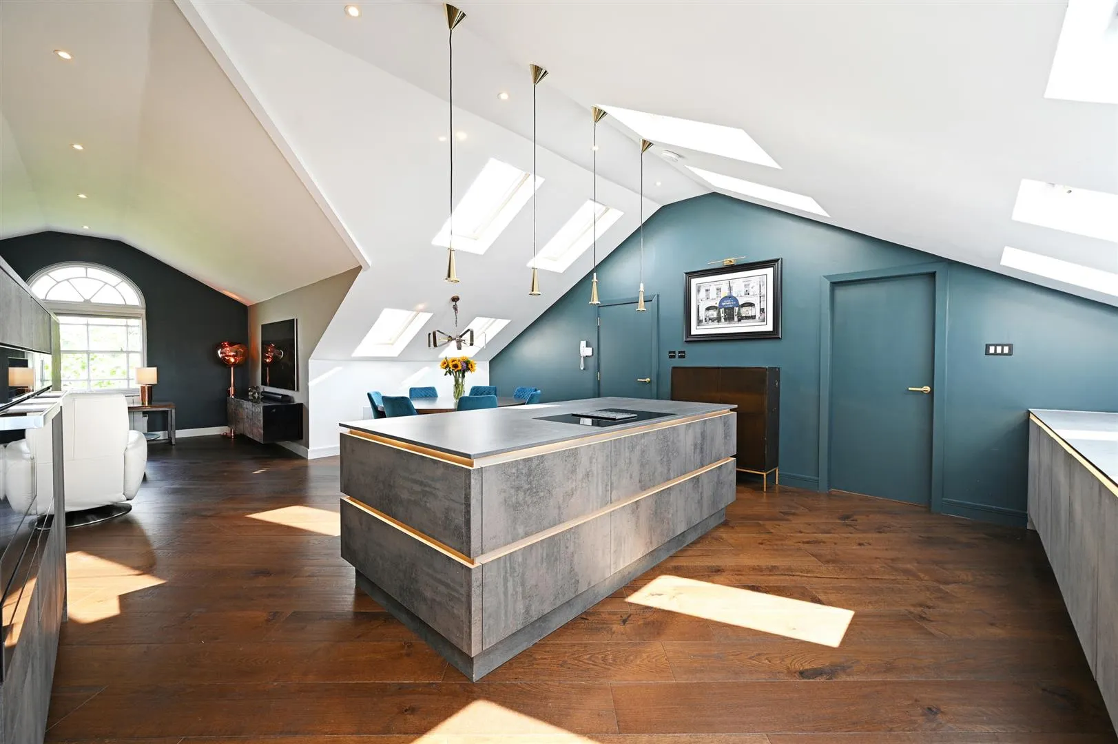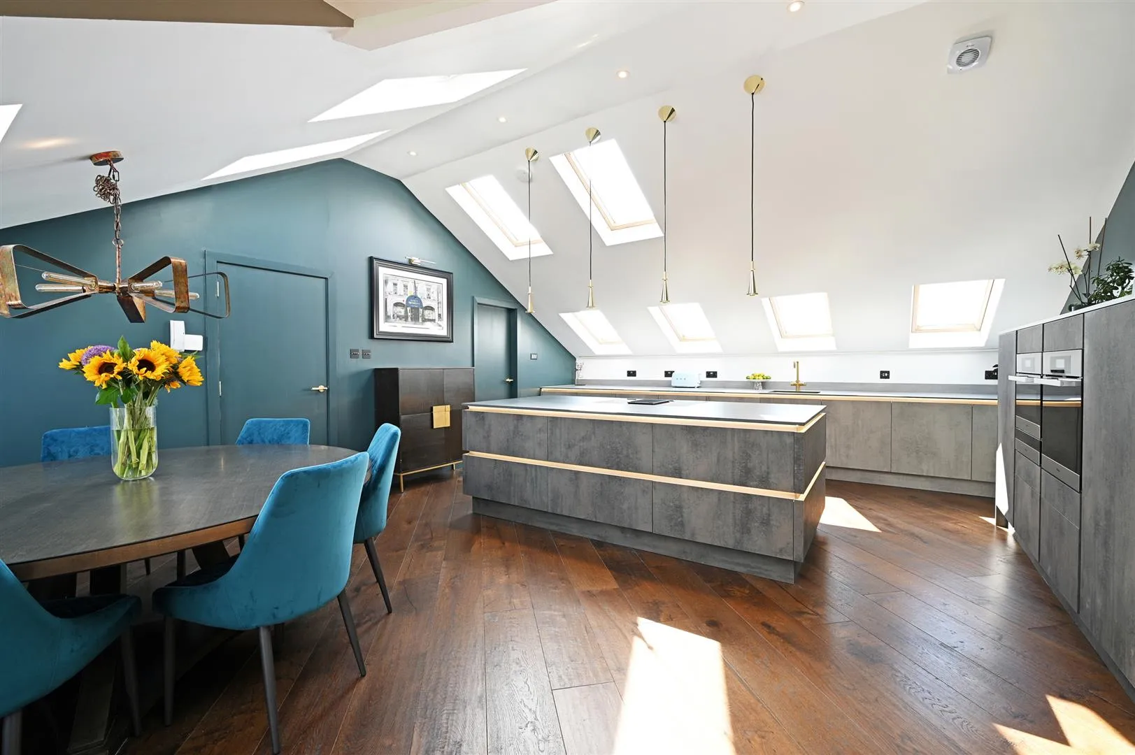 A fabulous open-plan space having Velux roof windows, a front facing timber double glazed sash window, recessed lighting, pendant light points, extractor fan, wall mounted light points, electric radiators, TV/aerial point and timber flooring. There is a range of fitted base/wall and drawer units incorporating a work surface, strip lighting and a 1.0 bowl sink with a quooker tap. Appliances include two ovens with a warming drawer and a fridge/freezer. There is also a separate central island with a matching work surface that has an integrated induction hob with an extractor vent. Fitted furniture includes shelving. Timber doors open to the office/bedroom 4 and the inner hall.