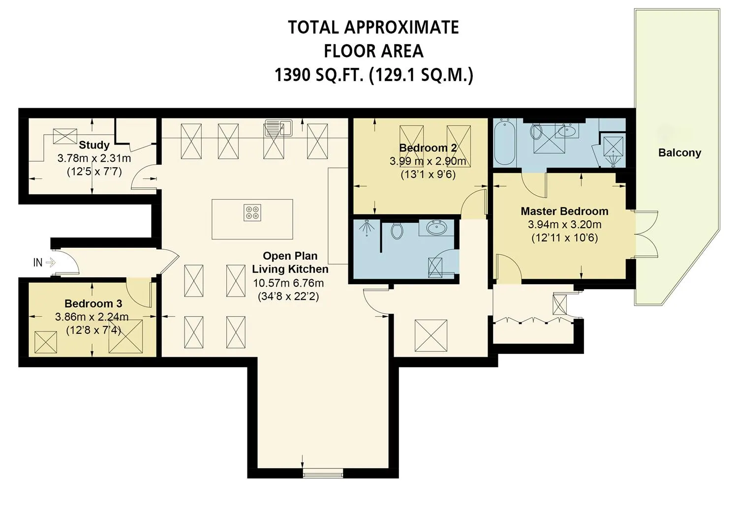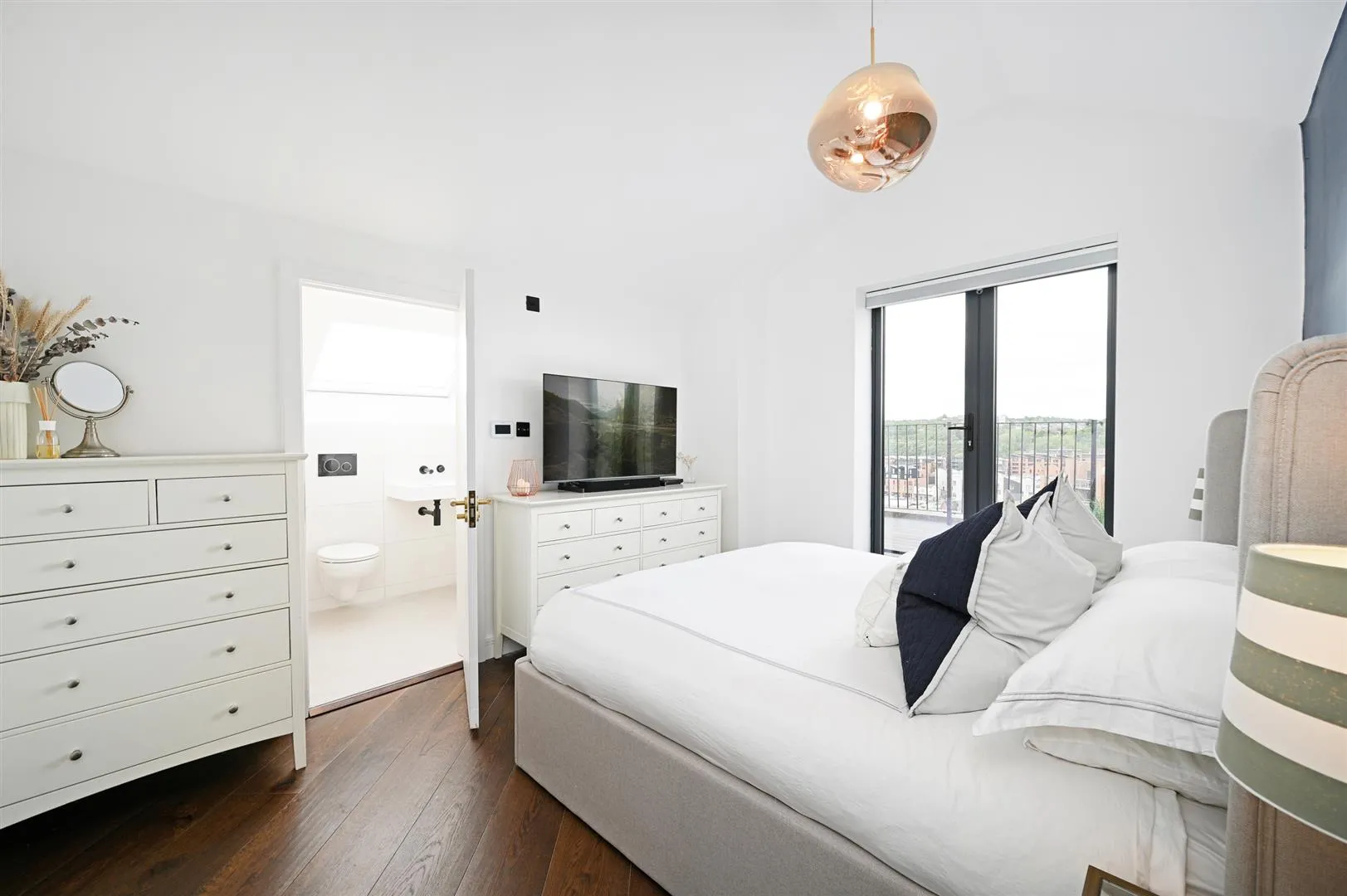 A fantastic master bedroom with a pendant light point, electric radiator, TV/aerial point and timber flooring. A timber door opens to the master en-suite bathroom and aluminium double doors with double glazed panels open to the balcony.