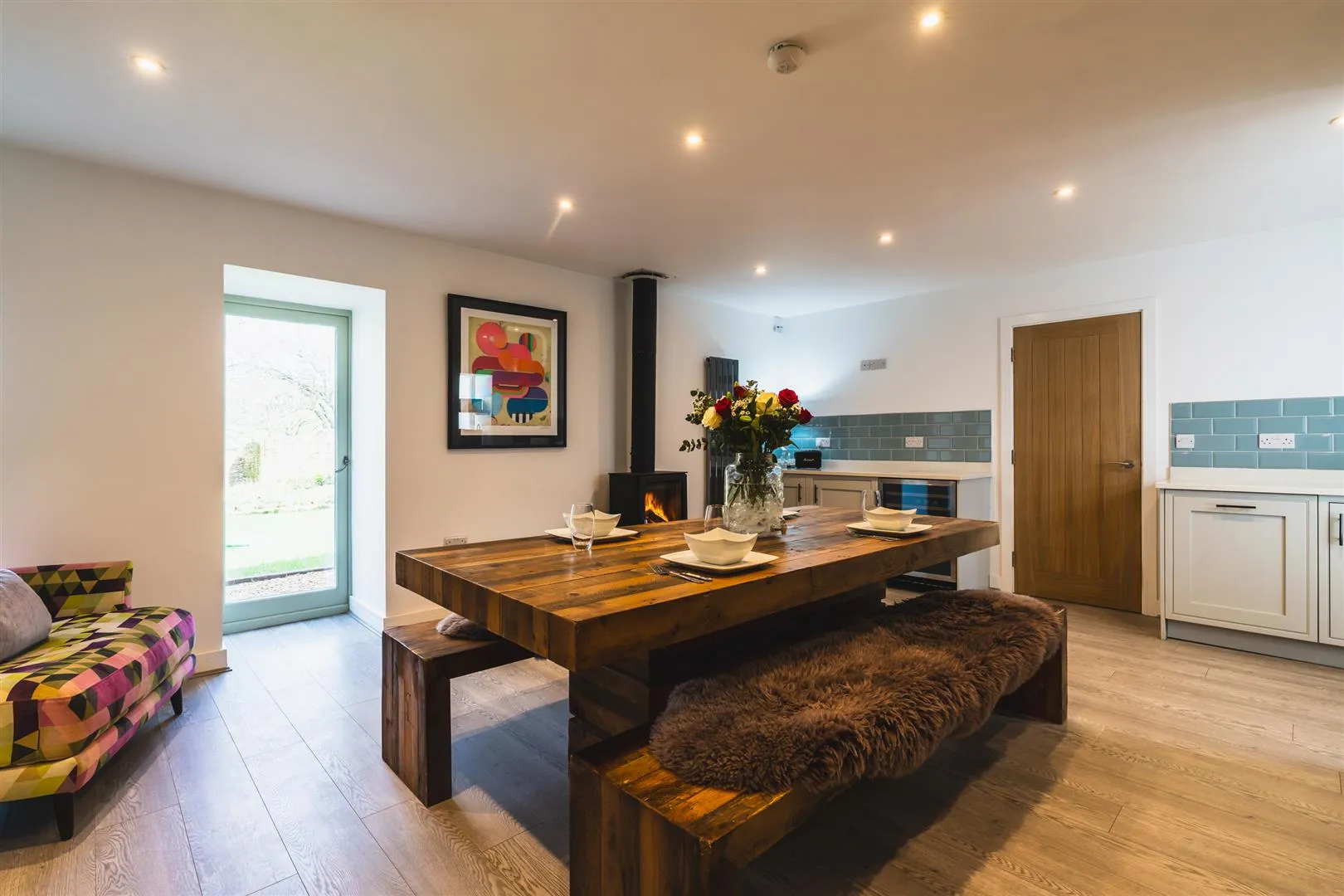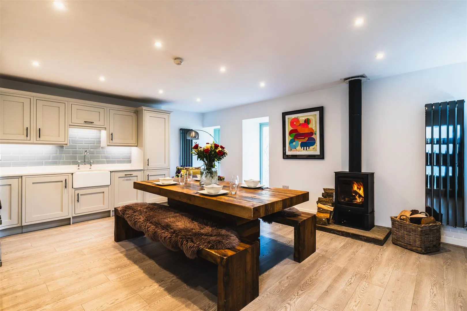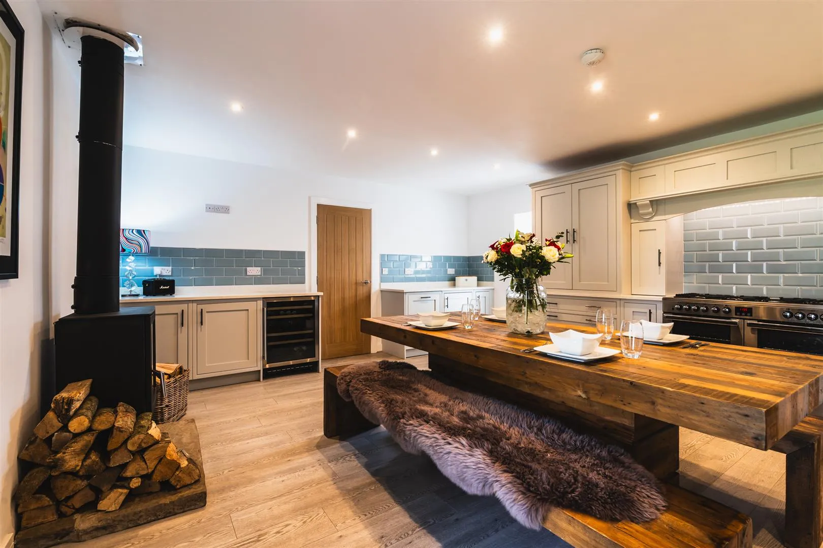 A stunning dining kitchen with front facing hardwood double glazed fully opening windows, a rear facing hardwood double glazed obscured panel, recessed lighting, central heating radiator, telephone point, TV/aerial point and timber effect flooring. The focal point of the room is the log burner, which sits on a stone hearth. A range of fitted base/wall and drawer units incorporate granite work surfaces, matching upstands, tiled splashbacks, under-counter lighting and an Innova Belfast sink with an Innova chrome mixer tap. The main cooking appliances is the Belling range cooker with a six-ring gas hob and a wok burner, two ovens, a grill and a storage drawer. The integrated appliances include an AEG dishwasher, a full-height AEG fridge/freezer and a CDA wine cooler.