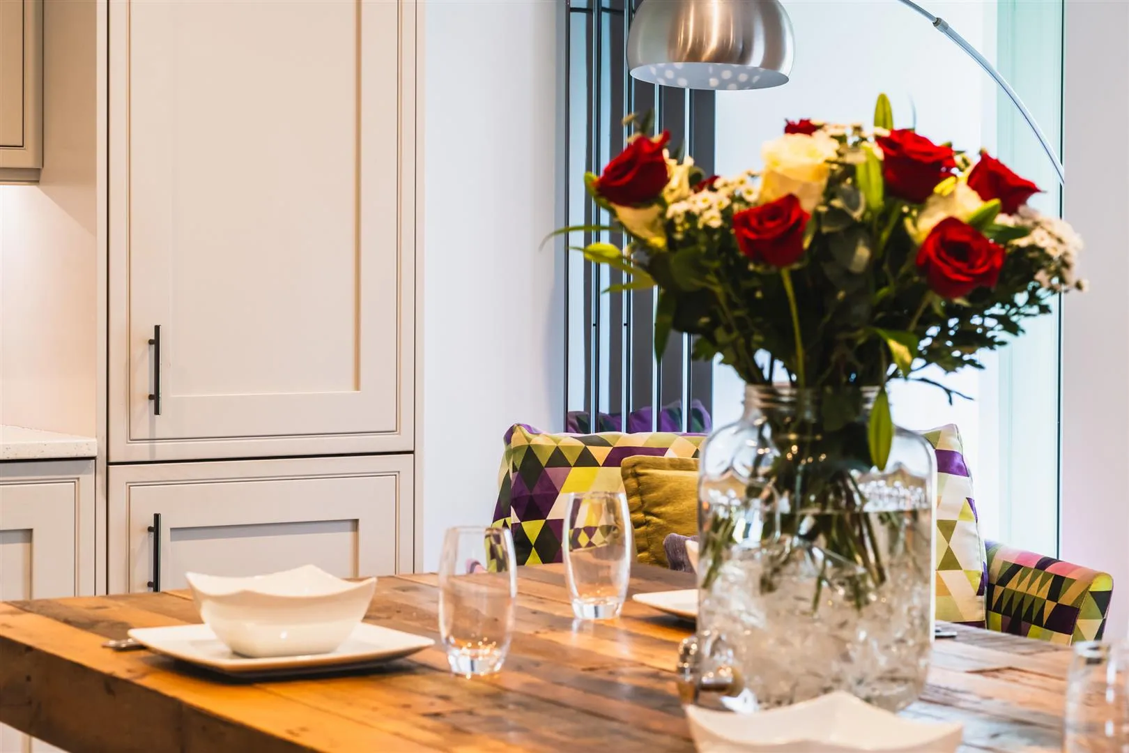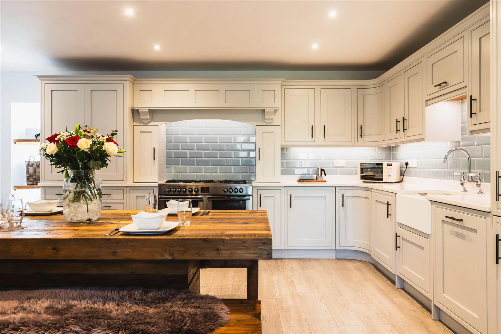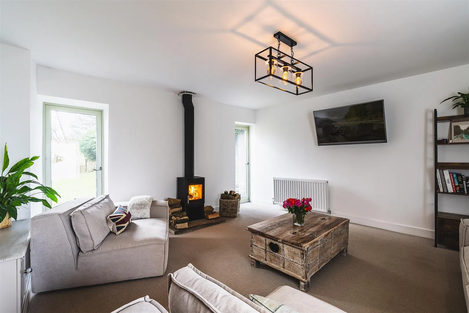 A stunning dining kitchen with front facing hardwood double glazed fully opening windows, a rear facing hardwood double glazed obscured panel, recessed lighting, central heating radiator, telephone point, TV/aerial point and timber effect flooring. The focal point of the room is the log burner, which sits on a stone hearth. A range of fitted base/wall and drawer units incorporate granite work surfaces, matching upstands, tiled splashbacks, under-counter lighting and an Innova Belfast sink with an Innova chrome mixer tap. The main cooking appliances is the Belling range cooker with a six-ring gas hob and a wok burner, two ovens, a grill and a storage drawer. The integrated appliances include an AEG dishwasher, a full-height AEG fridge/freezer and a CDA wine cooler.