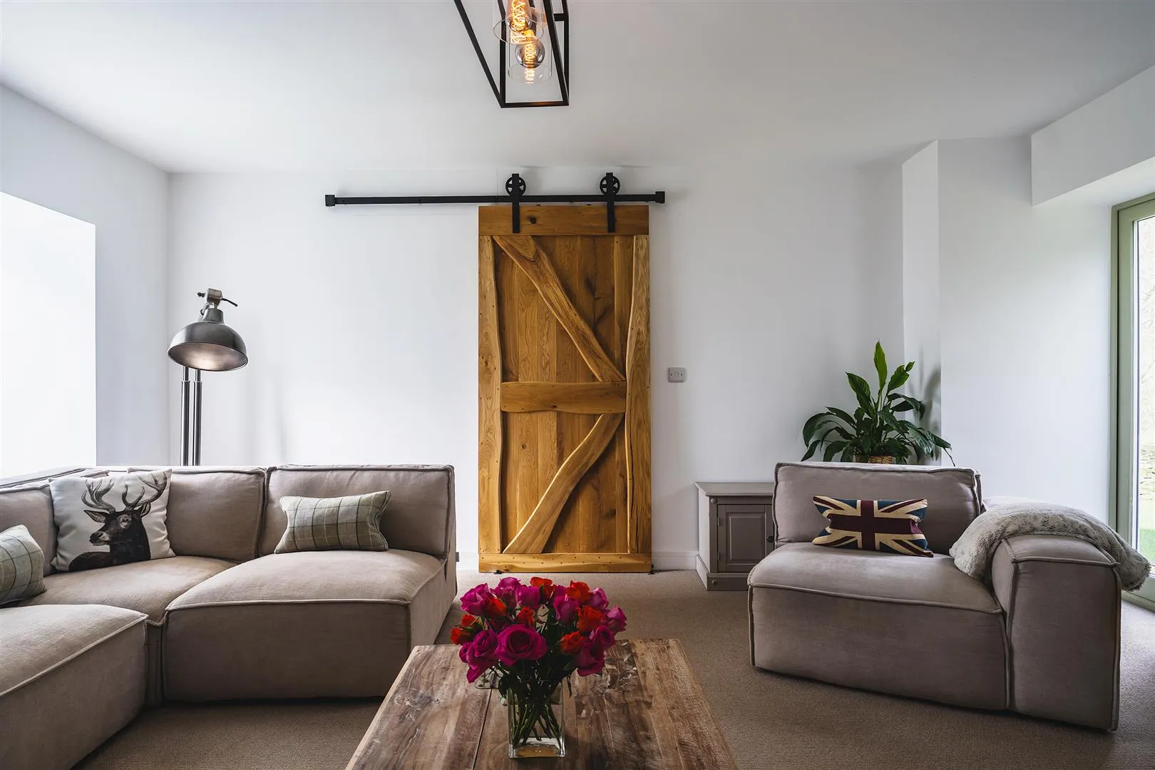 Having recessed lighting, central heating radiator and timber effect flooring. Oak doors open to the WC, under-stairs storage cupboard and dining kitchen. A sliding oak barn door also opens to the lounge.