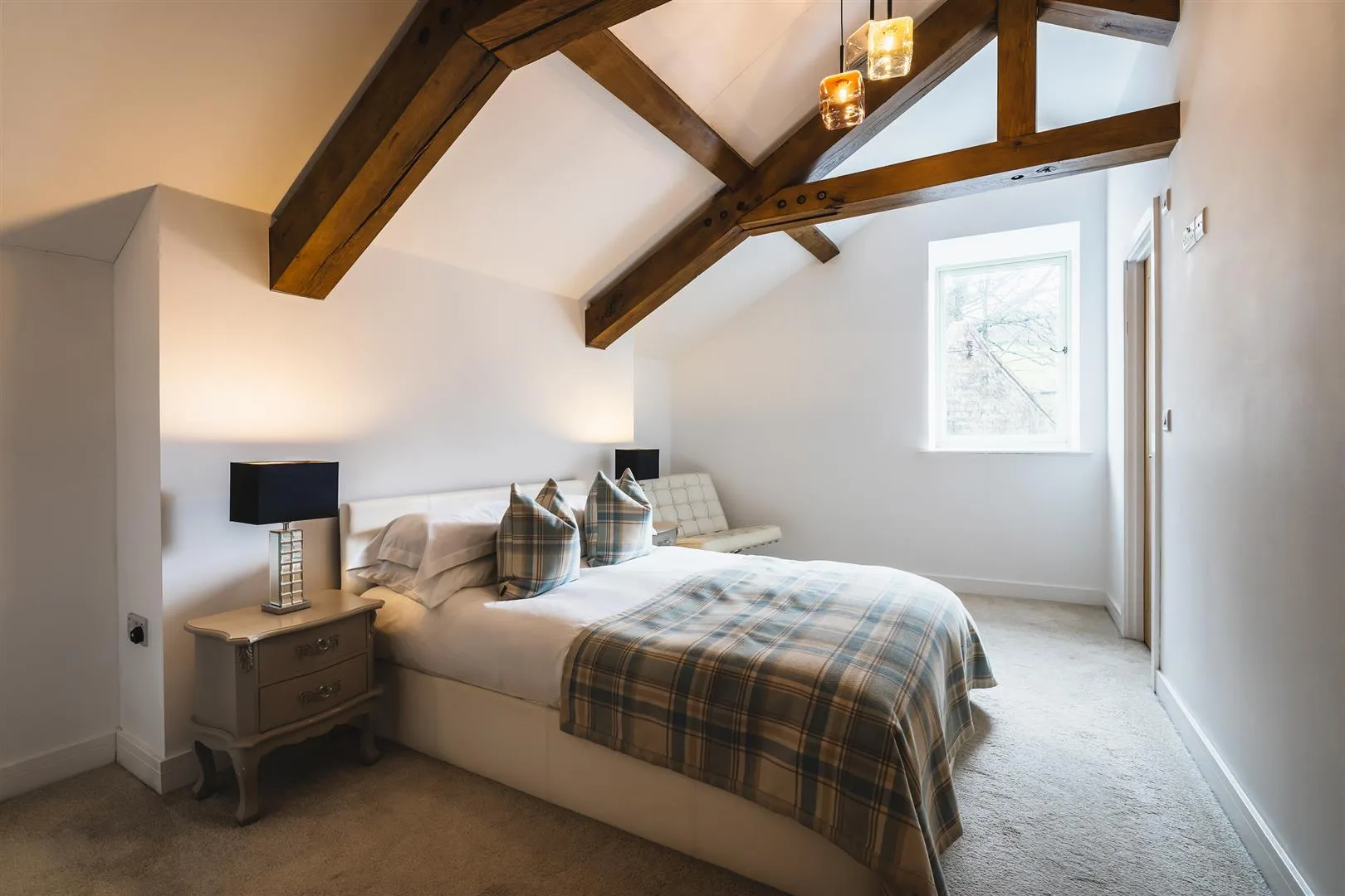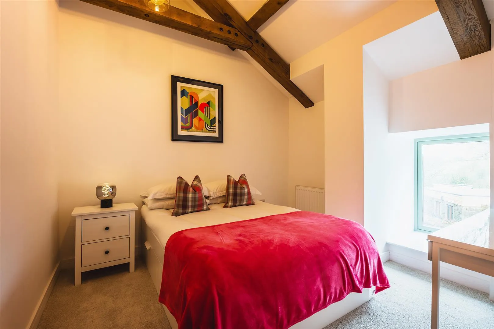 Another double bedroom with a front facing hardwood double glazed window, vaulted ceiling with exposed timber beams, pendant light point, central heating radiator and a TV/aerial point.
