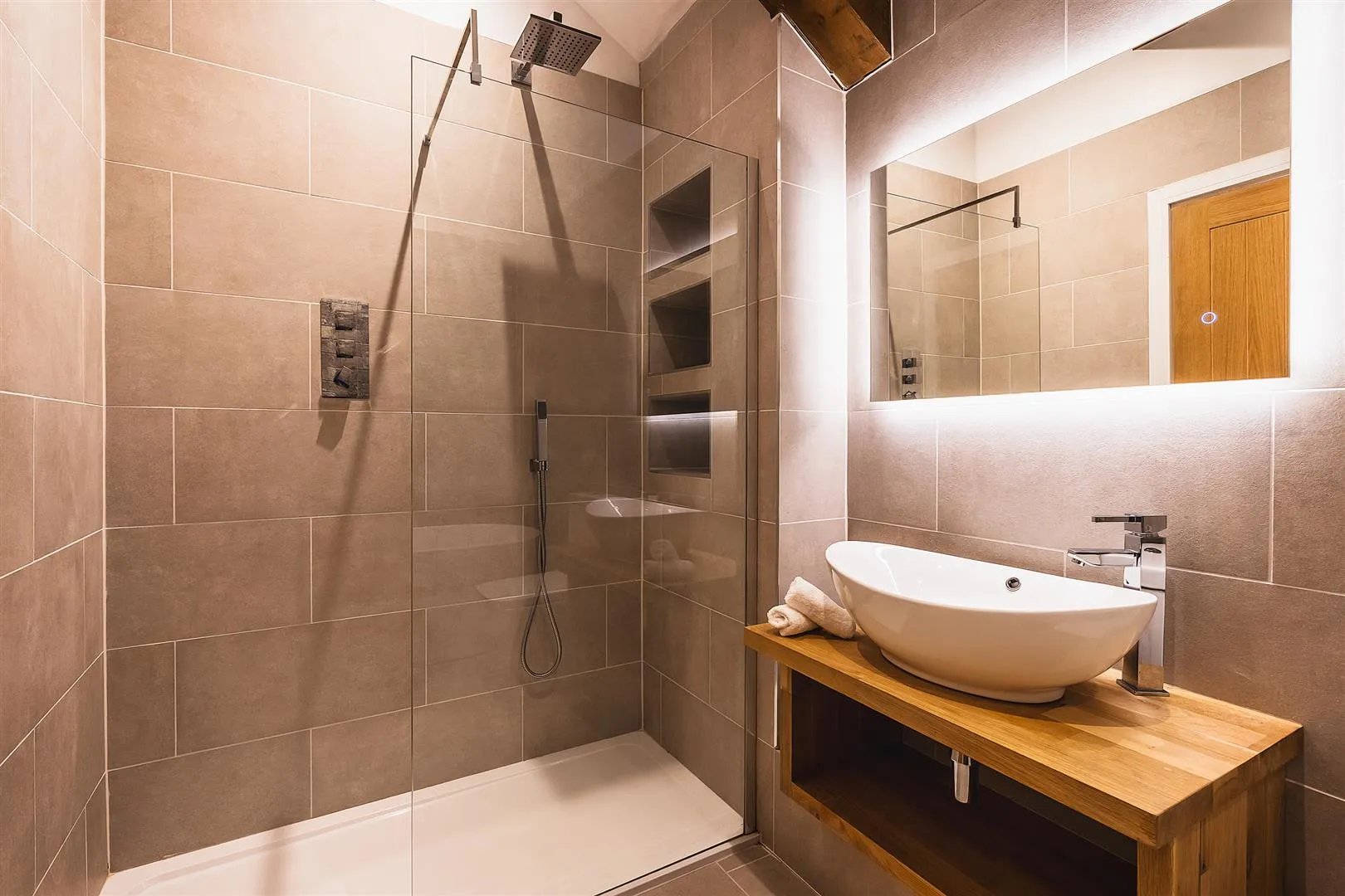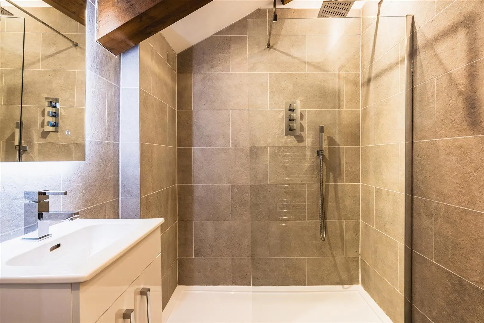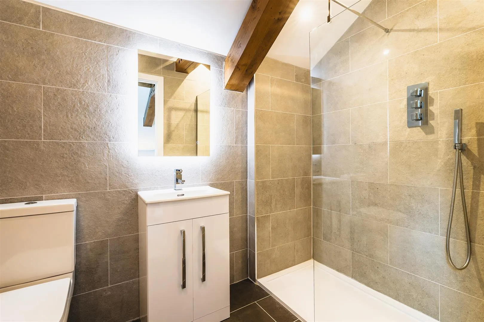 Being fully tiled and having an exposed timber beam, recessed lighting, extractor fan, chrome heated towel rail and an illuminated vanity mirror. A suite in white comprises a low-level WC and a wash hand basin with a chrome mixer tap and storage beneath. To one wall is a walk-in shower enclosure with a fitted rain head shower, an additional hand shower facility and a glazed screen.