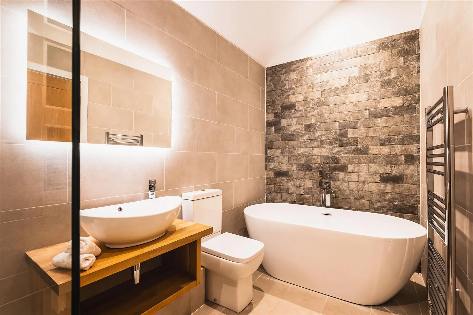 A luxurious family bathroom that is fully tiled and has a vaulted ceiling with exposed timber beams, recessed lighting, extractor fan, chrome heated towel rail and an illuminated vanity mirror. A suite in white comprises a low-level WC and a wall mounted oak vanity unit incorporating a wash hand basin with a chrome mixer tap and storage beneath. Also having a freestanding bath with a chrome mixer tap and a hand shower facility. To one wall is a walk-in shower enclosure with a fitted rain head shower, an additional hand shower facility, recessed tiled shelves and a glazed screen.