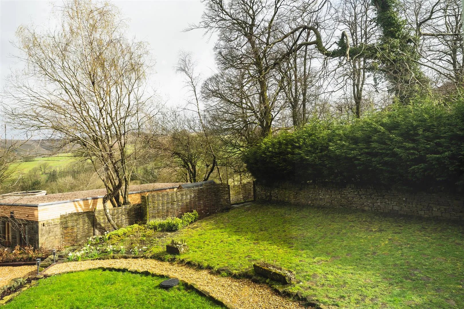 An opening within stone walling leads to the Quaker burial ground, which dates back to 1668 and is populated with mature trees and enclosed by dry stone walling. A wrought iron gate opens to the access road.