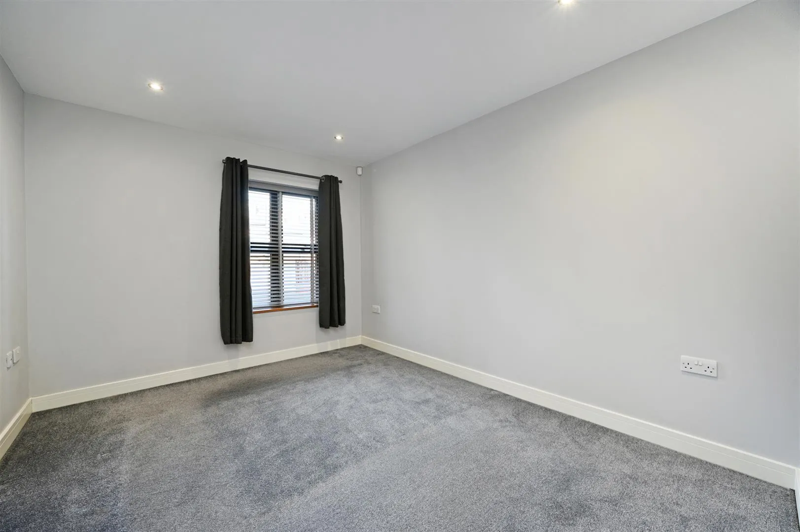 A double bedroom with a side facing aluminium double glazed window, recessed lighting, an electric heater and a TV/aerial/data point.