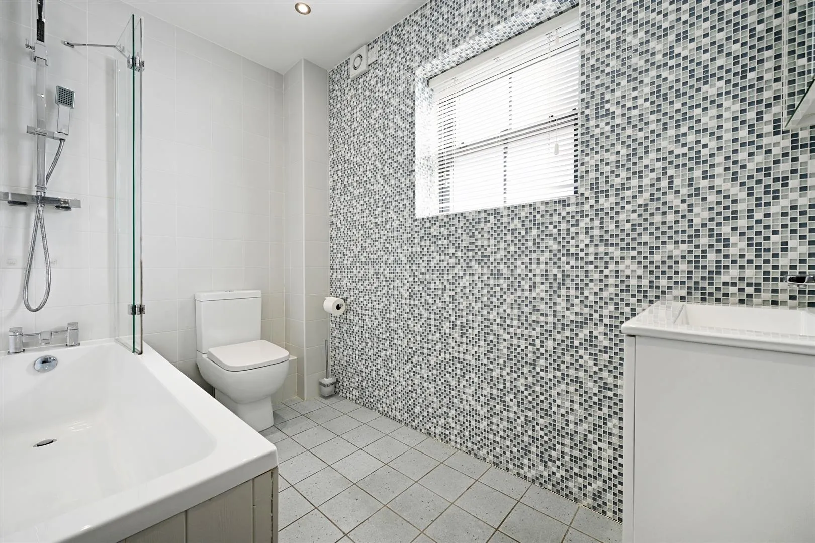 Being fully tiled and having a side facing aluminium double glazed obscured sash window, recessed lighting, extractor fan, chrome heated towel rail and a wall mounted cabinet with mirrored doors. A suite in white comprises a RAK Ceramics low-level WC and a wall mounted wash hand basin with an Instinct chrome mixer tap and storage beneath. To one corner is a panelled bath with an Instinct chrome mixer tap, a fitted rain head shower, an additional hand shower facility and a glazed screen.
