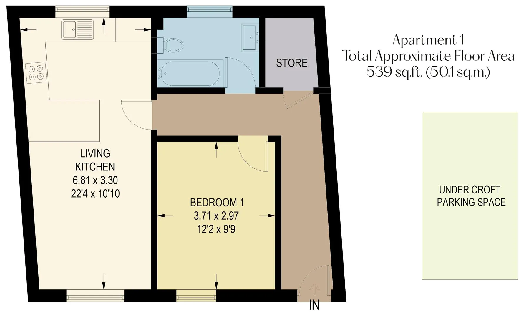 Having recessed lighting and timber effect flooring. Timber doors open to the living kitchen, bedroom 1, bathroom and storage cupboard.