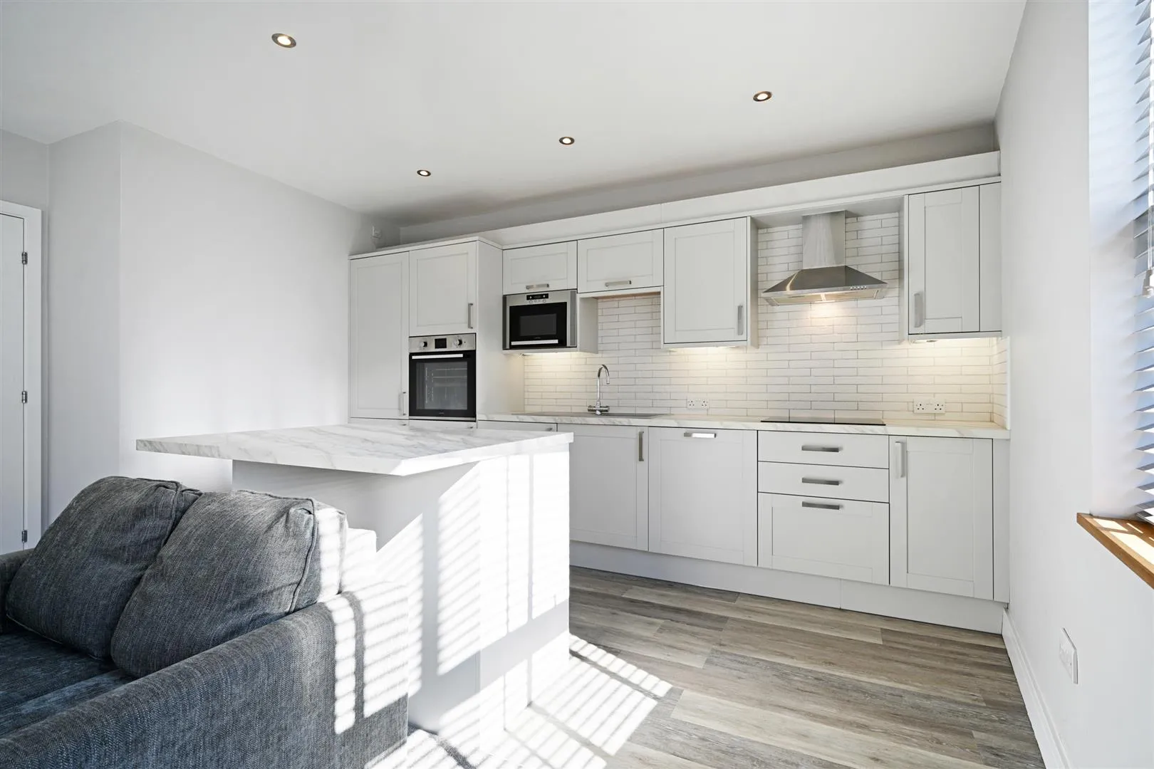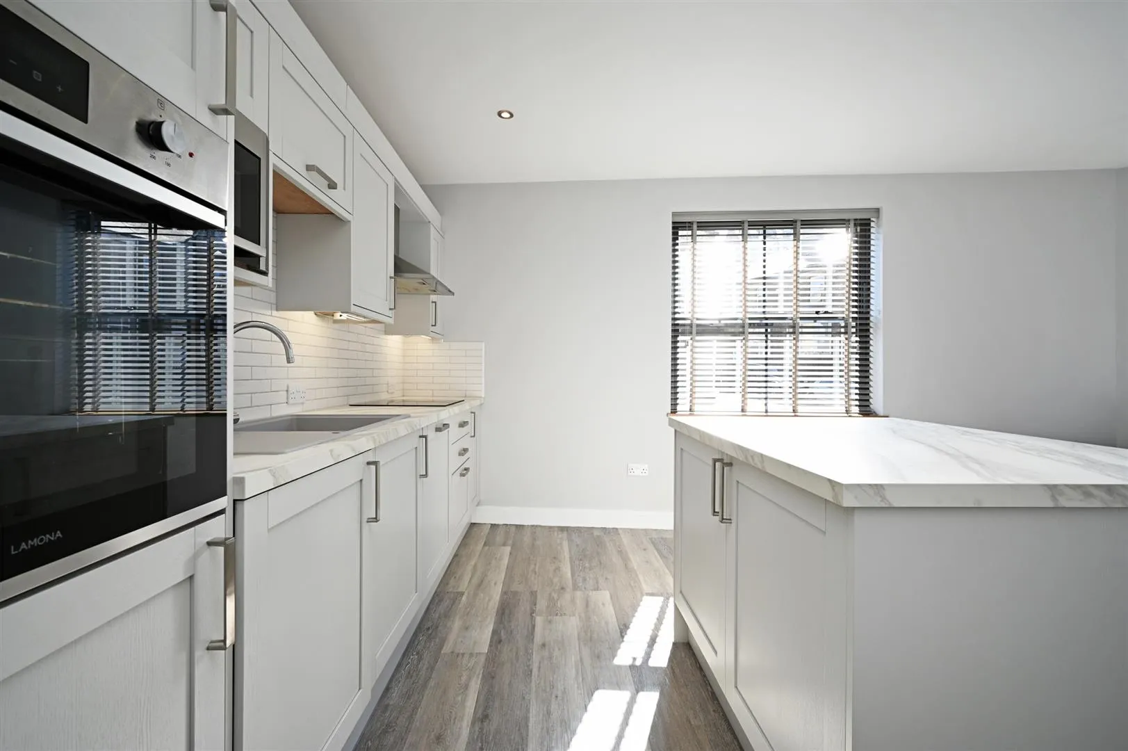 A superb living kitchen with front and side facing aluminium double glazed sash windows, recessed lighting, electric heaters and a TV/aerial/data point. The kitchen incorporates timber effect flooring and a range of fitted base/wall and drawer units with work surfaces, tiled splashbacks, under-counter lighting and an inset Lamona 1.0 bowl sink with a chrome mixer tap. Also having a central island providing additional storage and a matching work surface that extends to provide space for two chairs. The integrated appliances are by Lamona and include a four-ring induction hob with an extractor hood above, a fan assisted oven, a microwave, a dishwasher, a full-height fridge/freezer, and a washing machine.