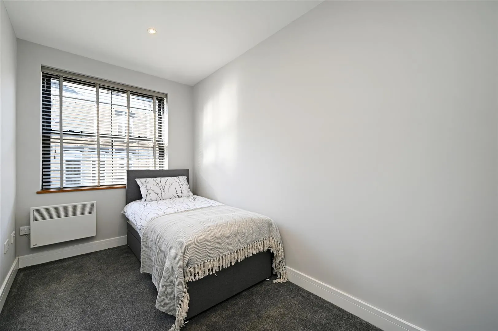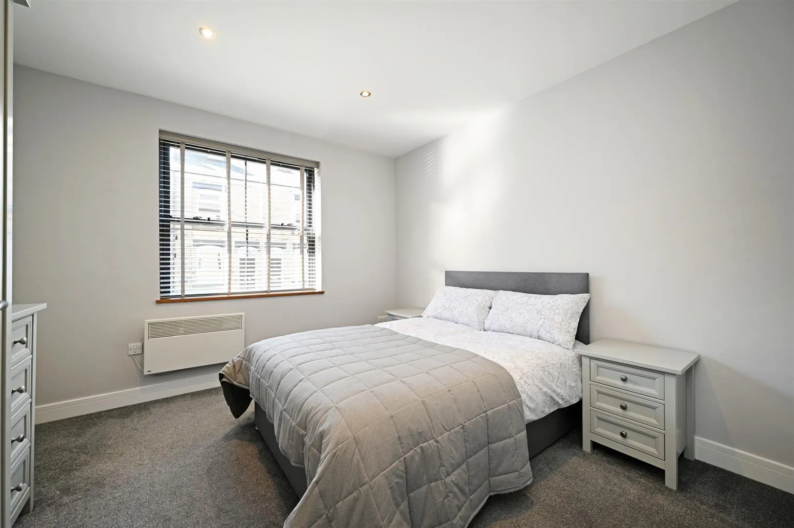 A good-sized double bedroom with a front facing aluminium double glazed sash window, recessed lighting, an electric heater and a TV/aerial/data point.