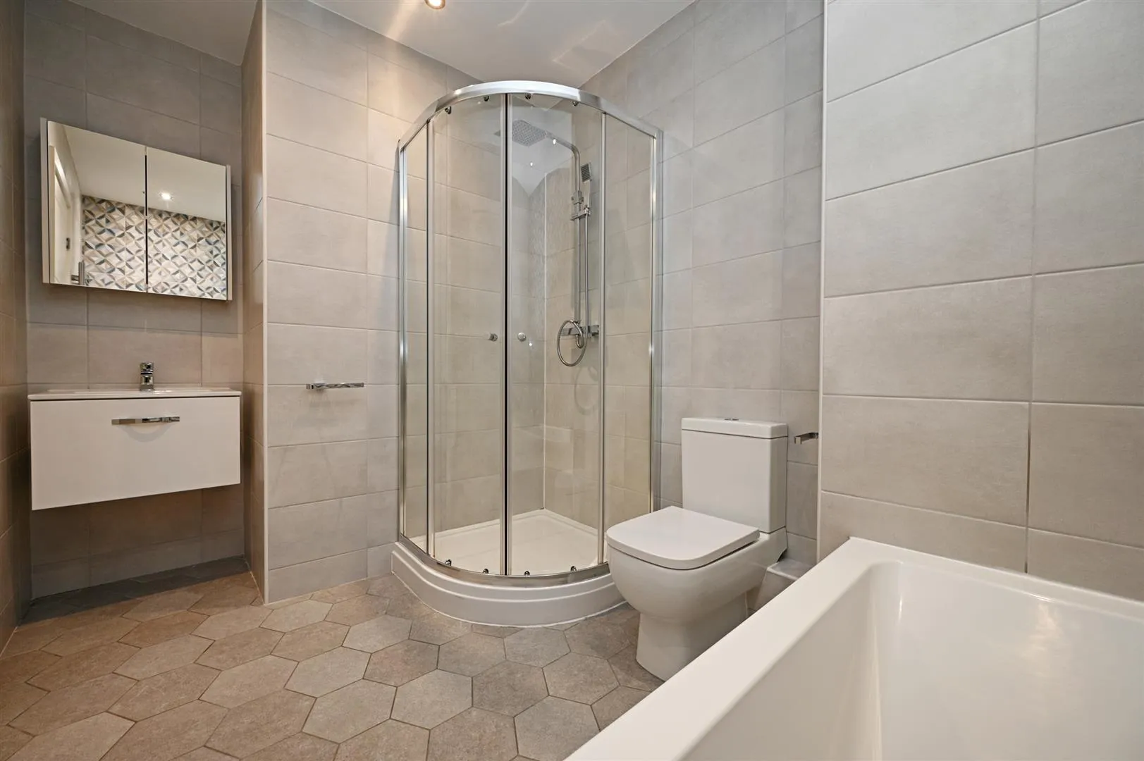 Being fully tiled and having recessed lighting, extractor fan, chrome heated towel rail and a wall mounted storage cabinet with mirrored doors. A suite in white comprises a RAK Ceramics low-level WC and a wall mounted wash hand basin with an Instinct chrome mixer tap and storage beneath. Also having a panelled bath with an Instinct chrome mixer tap. To one corner is a shower enclosure with a fitted rain head shower, an additional hand shower facility and a glazed screen/door.