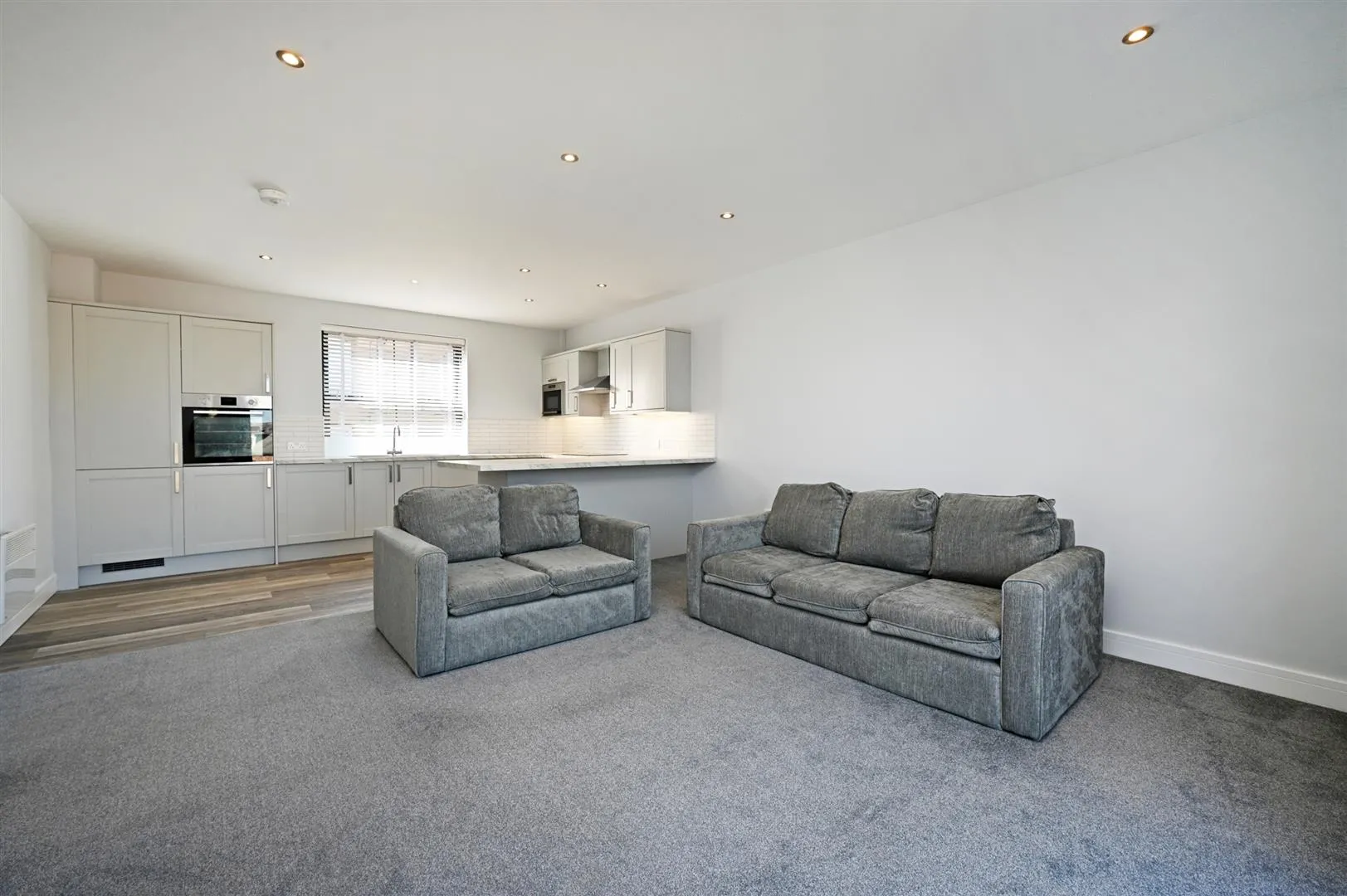 A bright living kitchen with a front facing aluminium double glazed sash window, recessed lighting, electric heaters and TV/aerial/data points. The kitchen incorporates timber effect flooring and a range of base/wall and drawer units with work surfaces, tiled splashbacks, under-counter lighting and an inset 1.5 bowl Lamona sink with a chrome mixer tap. The work surface extends to provide seating for four chairs. The integrated appliances are by Lamona and include a four-ring induction hob with an extractor hood above, a fan assisted oven, a microwave, a dishwasher, a full-height fridge/freezer and a washing machine. Double aluminium doors with double glazed panels open to a Juliet balcony with a glazed balustrade and looks out to suburban and green landscape views.