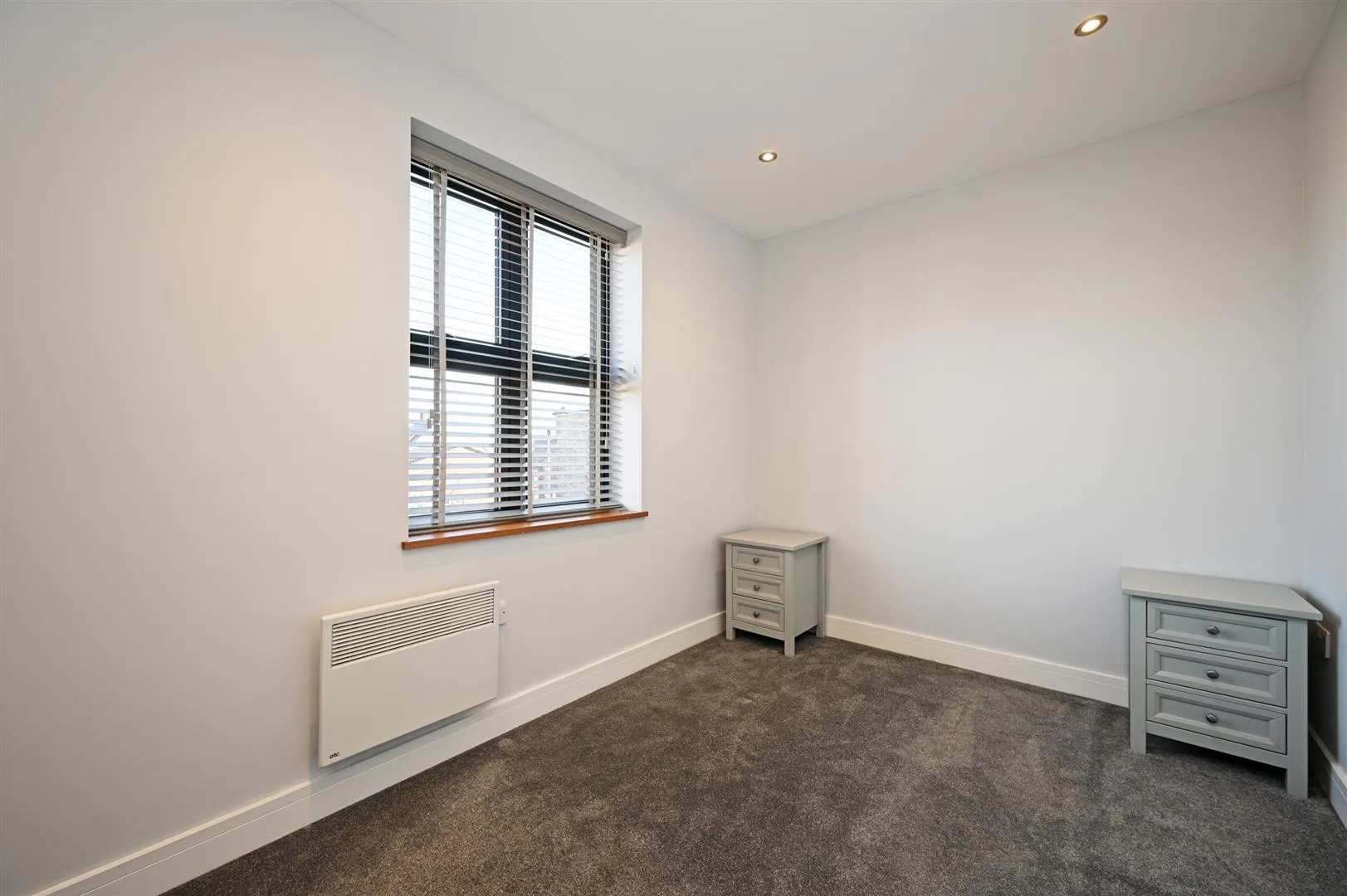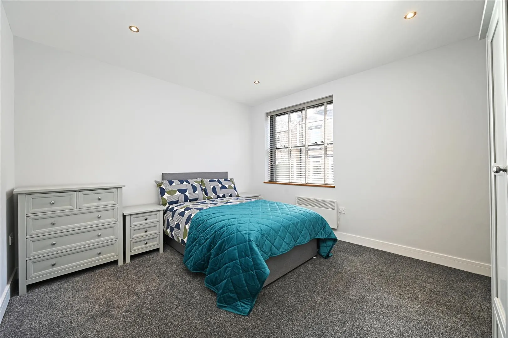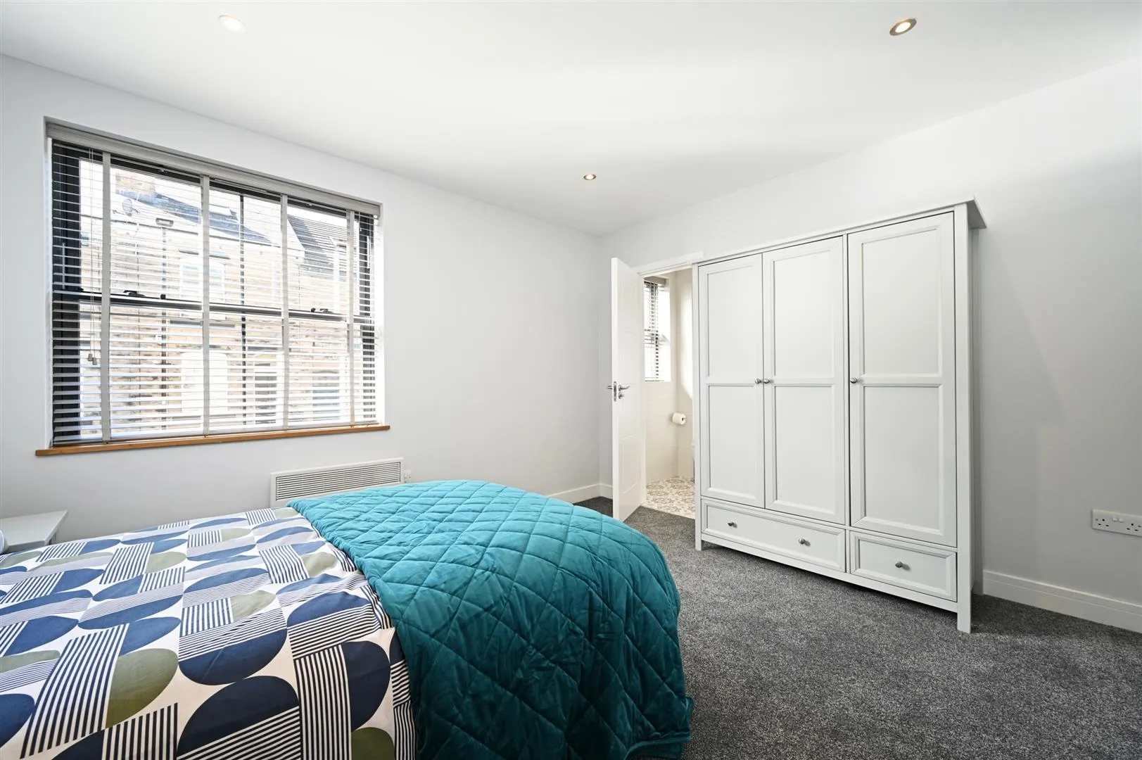 A good-sized double bedroom suite with a front facing aluminium double glazed sash window, recessed lighting, an electric heater and a TV/aerial/data point. A timber door opens to the bedroom 1 en-suite shower room.