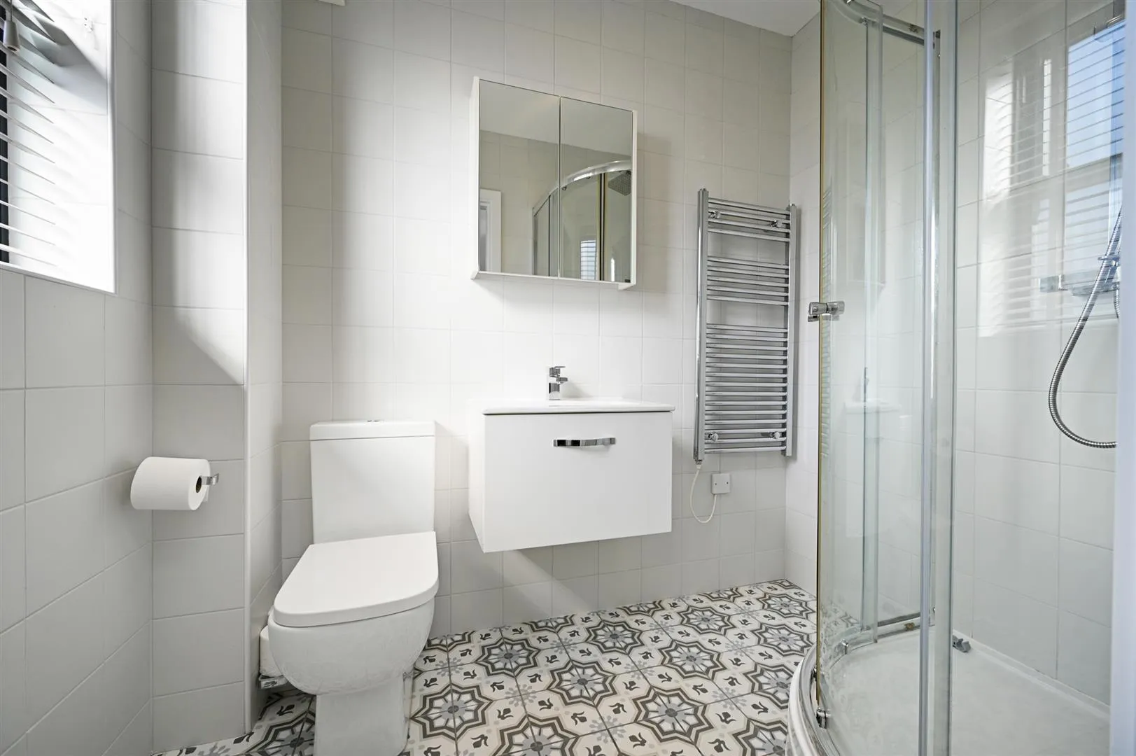 Being fully tiled and having a front facing aluminium double glazed obscured sash window, recessed lighting, extractor fan, chrome heated towel rail and a wall mounted storage cabinet with mirrored doors. A suite in white comprises a RAK Ceramics low-level WC and a wall mounted wash hand basin with an Instinct chrome mixer tap and storage beneath. To one corner is a shower enclosure with a fitted rain head shower, an additional hand shower facility and a glazed screen/door.