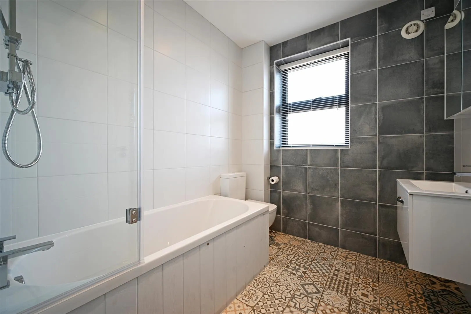 Being fully tiled and having a rear facing aluminium double glazed obscured window, recessed lighting, extractor fan, chrome heated towel rail and a wall mounted cabinet with mirrored doors. A suite in white comprises a RAK Ceramics low-level WC and a wall mounted wash hand basin with an Instinct chrome mixer tap and storage beneath. Also having a panelled bath with an Instinct chrome mixer tap, a fitted rain head shower, an additional hand shower facility and a glazed screen.