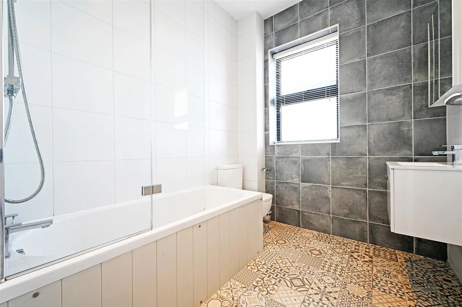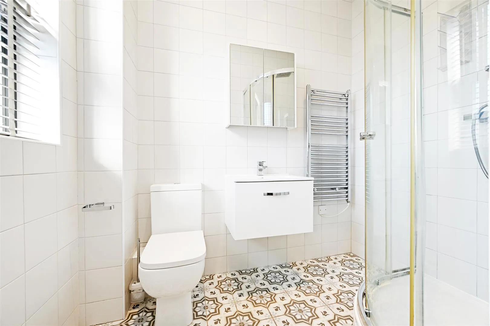 Being fully tiled and having a front facing aluminium double glazed obscured sash window, recessed lighting, extractor fan, chrome heated towel rail and a wall mounted storage cabinet with mirrored doors. A suite in white comprises a RAK Ceramics low-level WC and a wall mounted wash hand basin with an Instinct chrome mixer tap and storage beneath. To one corner is a shower enclosure with a fitted rain head shower, an additional hand shower facility and a glazed screen/door.