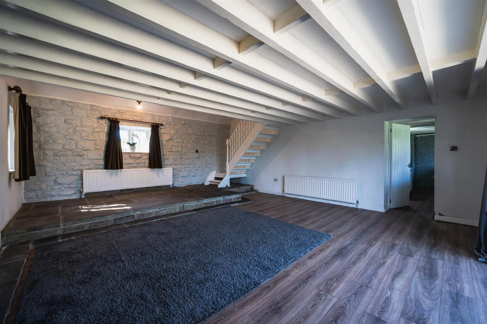 An exceptionally spacious reception room with rear and side facing UPVC double glazed windows, exposed timber beams, pendant light point, central heating radiator, TV/aerial point, partial laminate flooring and partial stone flagged flooring. The focal point of the room is the open dog grate fireplace with an oak mantel and a stone surround/hearth. Double UPVC doors with double glazed panels and matching side panels open to the front of the property.