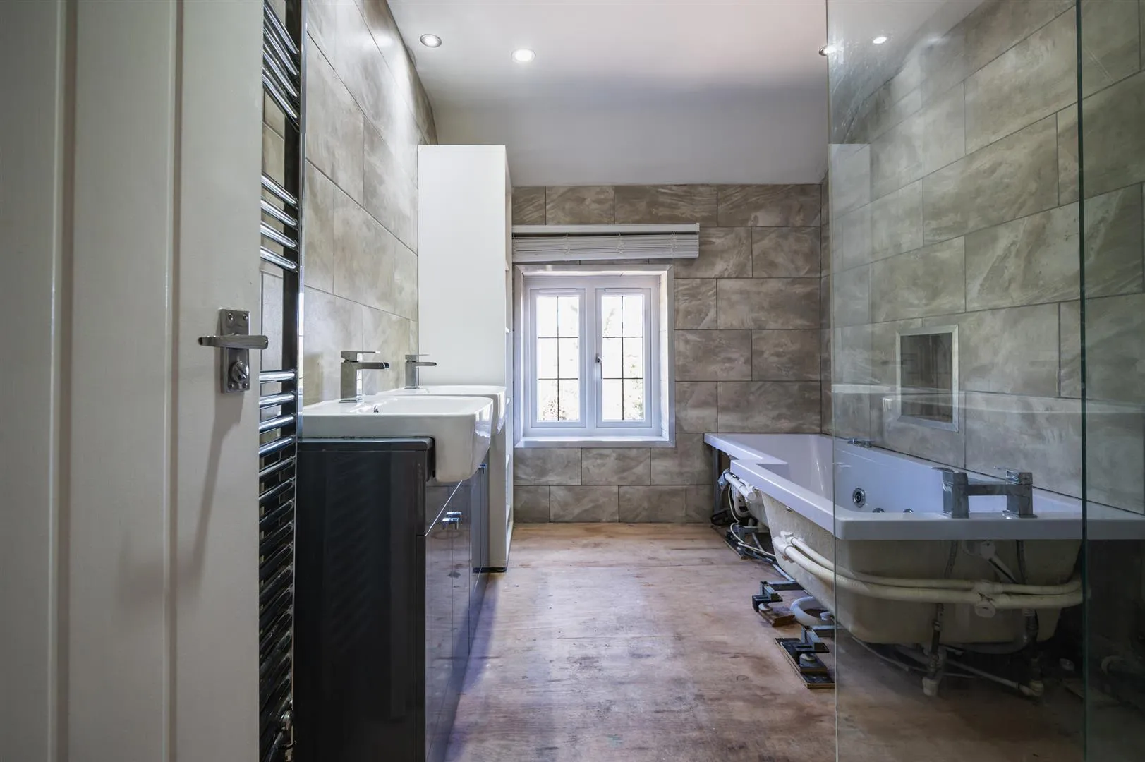Having a front facing UPVC double glazed window, recessed lighting and a chrome heated towel rail. A suite in white comprises two wash hand basins with chrome mixer taps and storage beneath, and a panelled spa bath with a chrome mixer tap and a recessed tiled shelf above. To one corner is a walk-in shower enclosure with a fitted rain head shower, an additional hand shower facility, a recessed tiled shelf and a glazed screen. Access can be gained to a loft space.