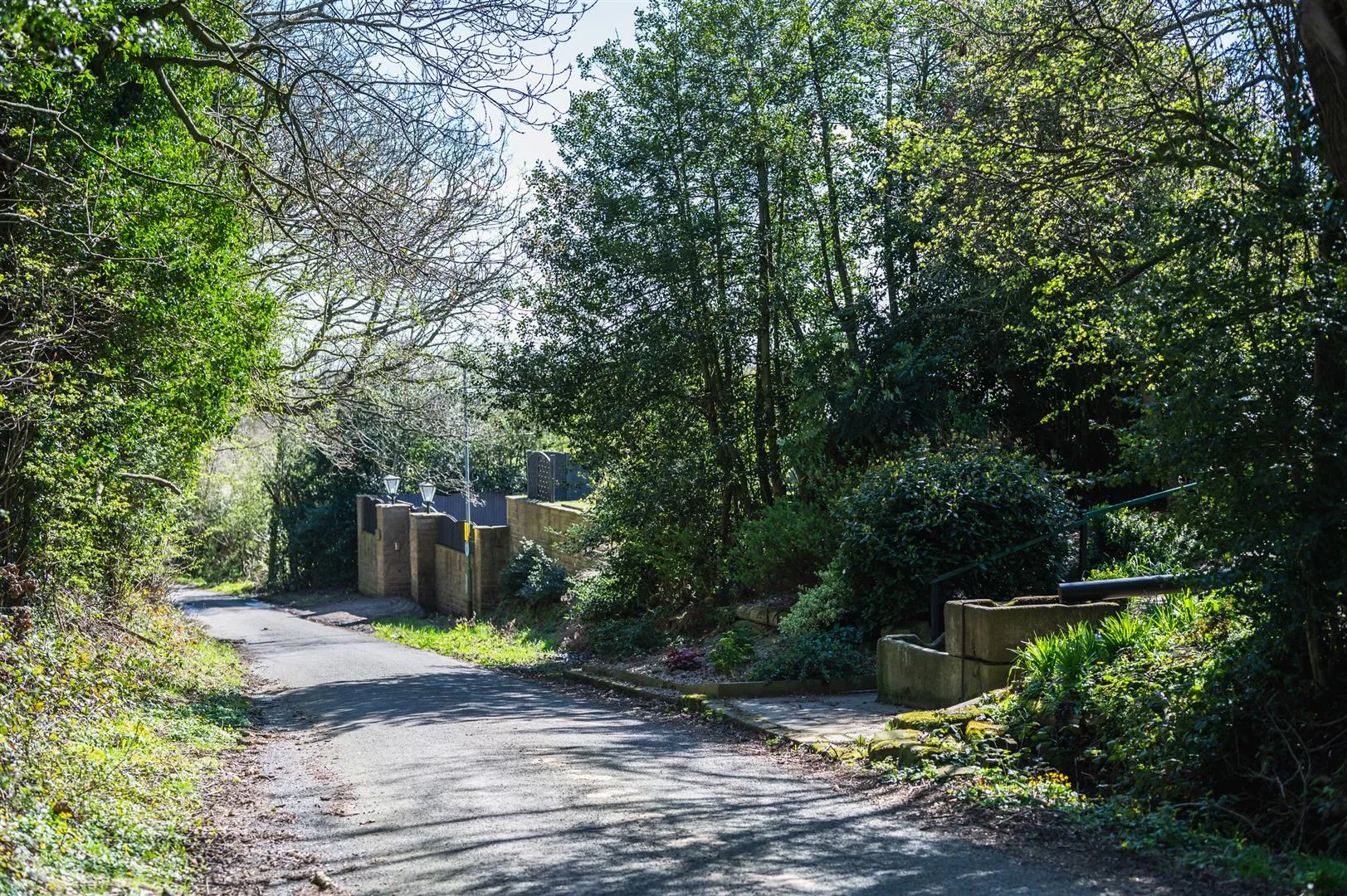 From Spout House Lane, a sliding timber gate set between two pillars with exterior lighting opens to Spout House.