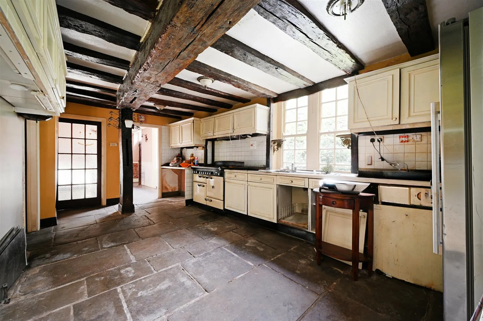 The property is in need of modernisation, however, this can be seen as an opportunity to curate a wonderful home. The reception rooms are exceptionally spacious and filled with character. On the first floor are two double bedroom suites and two additional double bedrooms, with one having an original 15th-century vaulted ceiling. To the front of the property is a garden featuring mature trees, plants and a pond. To the rear is an outstanding garden, filled with a wide variety of plants and trees and there is a triple garage.